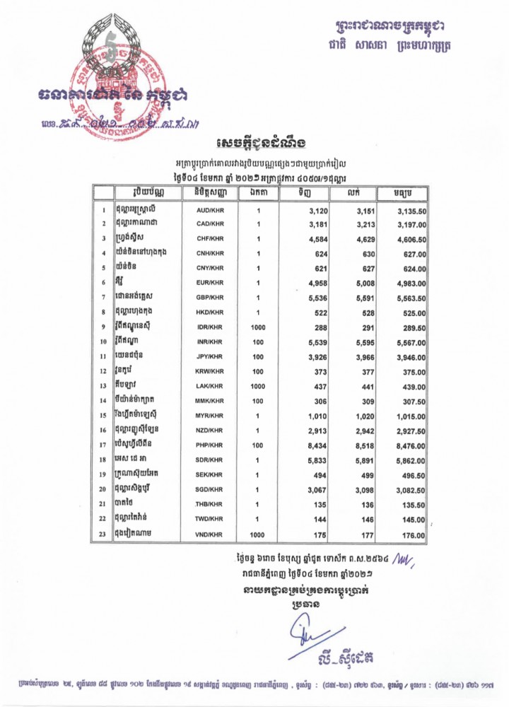 អត្រាប្តូរប្រាក់រវាងរូបីយប័ណ្ណផ្សេងៗជាមួយប្រាក់រៀល សម្រាប់ថ្ងៃទី០៤ ខែមករា ឆ្នាំ២០២១