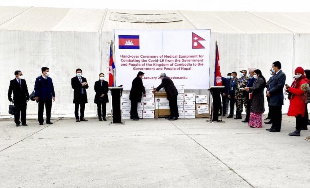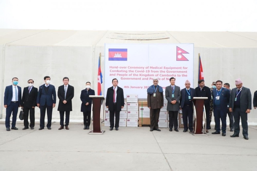 អំណោយមនុស្សធម៌ជាសម្ភារ បរិក្ខារវេជ្ជសាស្ត្ររបស់កម្ពុជា ត្រូវបានប្រគល់ជូនសាធារណរដ្ឋប្រជាធិបតេយ្យសហព័ន្ធនេប៉ាល់ដើម្បីចូលរួមទប់ស្កាត់ជំងឺកូវីដ-១៩