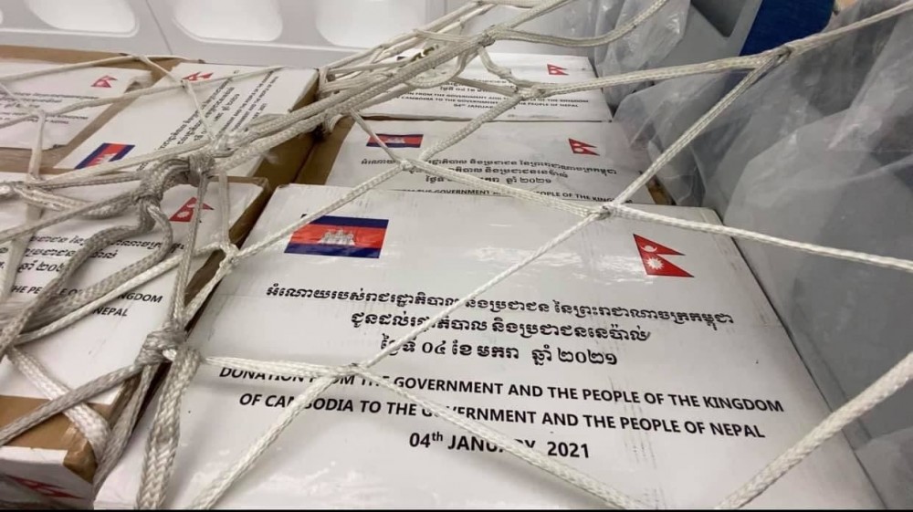 AKP ភ្នំពេញ ថ្ងៃទី០៤ ខែមករា ឆ្នាំ២០២១ -- អំណោយជាសម្ភារបរិក្ខារវេជ្ជសាស្ត្ររបស់របស់រាជរដ្ឋាភិបាលកម្ពុជា ដើម្បីចូលរួមទប់ស្កាត់ជំងឺកូវីដ-១៩ ដែលដឹកជញ្ជូនតាមយន្តហោះពិសេសរបស់ព្រះរាជាណាចក្រកម្ពុជានោះ បានប្រគល់ជូនសាធារណរដ្ឋប្រជាធិបតេយ្យសហព័ន្ធនេប៉ាល់ហើយ នាព្រឹកថ្ងៃទី០៤ ខែមករា ឆ្នាំ២០២១ ដែលពិធីប្រគល់និងទទួលអំណោយមនុស្សធម៌នេះ ត្រូវបានធ្វើឡើង ដោយឯកឧត្តម អ៊ុច បូររិទ្ធ រដ្ឋមន្រ្តីប្រតិភូអមនាយករដ្ឋមន្រ្តី តំណាងដ៏ខ្ពង់ខ្ពស់សម្តេចអគ្គមហាសេនាបតីតេជោ ហ៊ុន សែន និងឯកឧត្តម រាយដេអេស ធ្រីបភើស៊ី (Hridayesh Tripathi) រដ្ឋមន្រ្តីសុខាភិបាលនេប៉ាល់ នៅទីក្រុងកដ្ឋមណ្ឌូ ប្រទេសនេប៉ាល់។