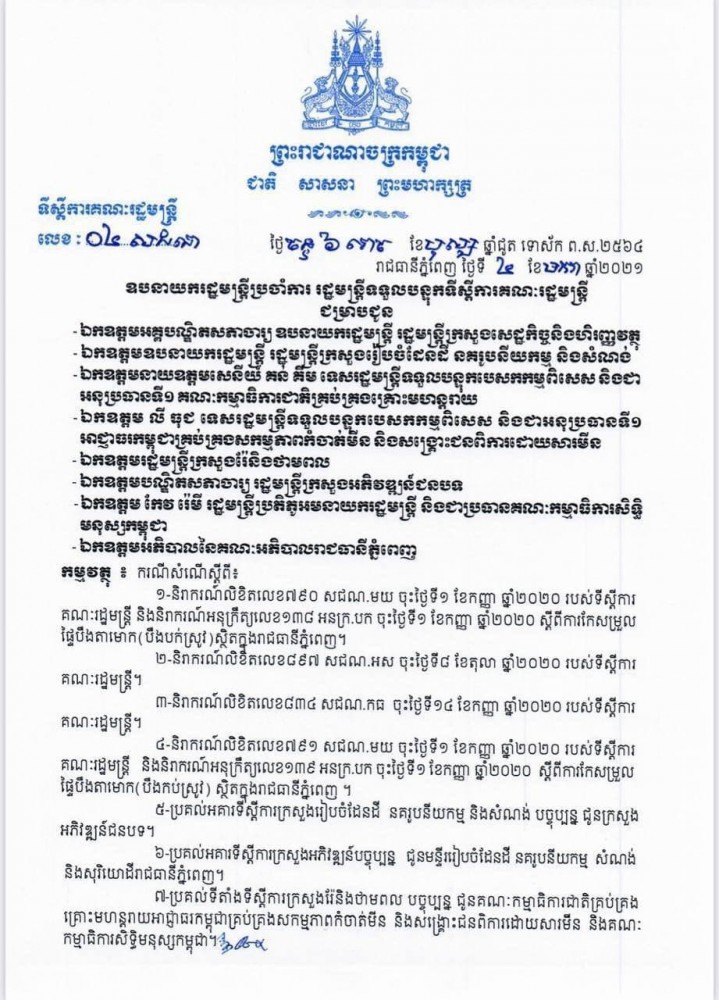 រាជរដ្ឋាភិបាលសម្រេចនិរាករណ៍លិខិតរដ្ឋបាលមួយចំនួន ពាក់ព័ន្ធនឹងផ្ទៃបឹងតាមោក (បឹងកប់ស្រូវ)