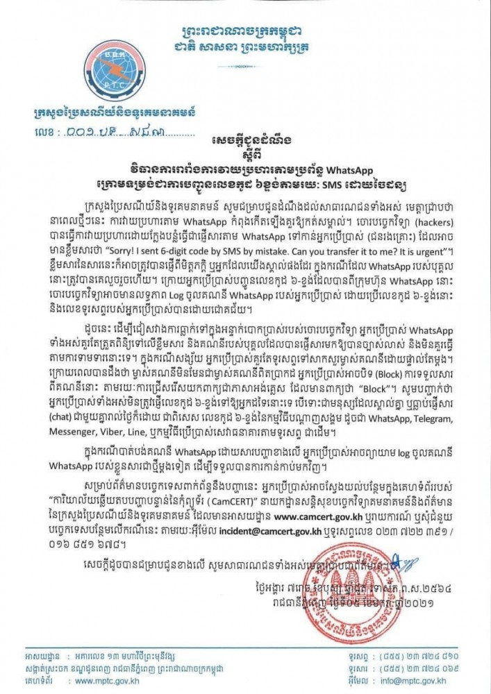 ក្រសួងប្រៃសណីយ៍ ជូនដំណឹងពីវិធានការរារាំងការវាយប្រហារតាមប្រព័ន្ធ WhatApp ក្រោមទម្រង់ជាការបញ្ជូនលេខកូដ៦ខ្ទង់តាមរយ: SMS ដោយចៃដន្យ