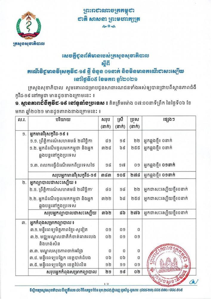 កម្ពុជាបន្តរកឃើញករណីវិជ្ជមានកូវីដ-១៩ ថ្មី ចំនួន ០១នាក់ ដែលជាពលករមកពីប្រទេសថៃ