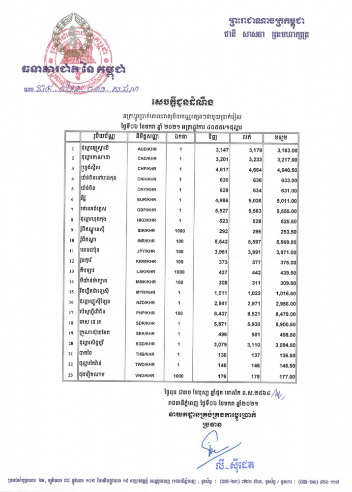 អត្រាប្តូរប្រាក់រវាងរូបីយប័ណ្ណផ្សេងៗជាមួយប្រាក់រៀល សម្រាប់ថ្ងៃទី០៦ ខែមករា ឆ្នាំ២០២១