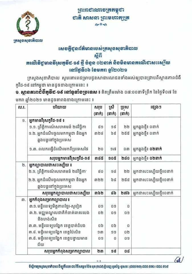 មានករណីវិជ្ជមានវីរុសកូវីដ-១៩ ថ្មី ចំនួន ០២នាក់ ដែលជាពលករមកពីប្រទេសថៃ និងមិនមានអ្នកជាសះស្បេីយនោះទេ គិតត្រឹមថ្ងៃនេះ