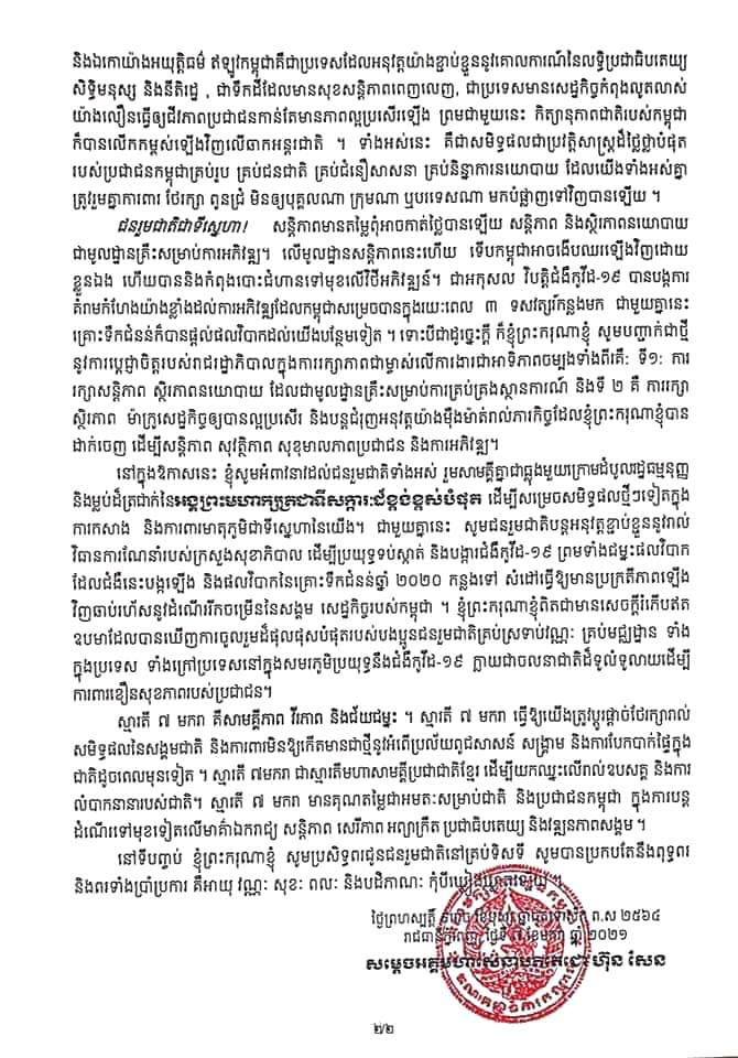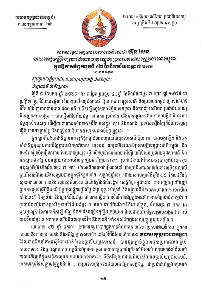 សារលិខិតរបស់ សម្តេចតេជោ ហ៊ុន សែន នាយករដ្ឋមន្ត្រី និងជា ប្រធានគណបក្សប្រជាជនកម្ពុជា ក្នុងឱកាសខួបទី៤២ឆ្នាំ ទិវាជ័យជម្នះ ៧មករា
