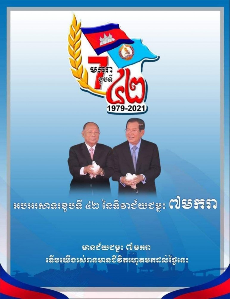 នៅលើផេកផ្លូវការ នាព្រឹកថ្ងៃទី០៧ ខែមករា ឆ្នាំ២០២១ សម្តេចអគ្គមហាពញាចក្រី ហេង សំរិន បានសរសេរថា ថ្ងៃទី០៧ មករា ឆ្នាំ១៩៧៩-០៧ មករា ឆ្នាំ២០២១ ជាថ្ងៃគម្រប់ខួបលើកទី៤២ នៃទិវាជ័យជម្នះប្រវត្តិសាស្រ្តរបស់ប្រជាជនកម្ពុជា ដែលបានវាយផ្តួលរំលំរបបប្រល័យពូជសាសន៍ ប៉ុល ពត បញ្ចប់សម័យកាលដ៏ខ្មៅងងឹតបំផុត ដែលបានកាប់សម្លាប់ និងធ្វើឱ្យយប្រជាពលរដ្ឋខ្មែរស្លាប់ជិត ៣លាននាក់។ សម្តេចប្រធានកបានលើកឡើងថា ដោយសារតែជំងឺកូវីដ-១៩ យើងមិនបានរៀបចំពិធីមីទ្ទីងអធិកអធមដូចរាល់ឆ្នាំ តែប្រជាពលរដ្ឋ និងអាជ្ញាធរនៅតាមមូលដ្ឋាន បានរៀបចំពិធីតូចៗ ដើម្បី រម្លឹកនូវអនុស្សាវរីយ៍ថ្ងៃជ័យជម្នះជាប្រវត្តិសាស្រ្ត ដែលបានផ្តល់កំណើតទី២ ដល់យើងគ្រប់គ្នា ក្នុងស្មារតីចងចាំជានិច្ចនូវគុណូបការៈដ៏ឧត្តុង្គឧត្តមរបស់វីរកម្មាភិបាល យុទ្ធជន យុទ្ធនារី នៃរណសិរ្សសាមគ្គីសង្រ្គោះជាតិកម្ពុជា និងវីរកងទ័ពស្ម័គ្រចិត្តប្រទេសជាមិត្ត ដែលបានធ្វើការលះបង់យ៉ាងធំធេង ក្នុងការប្រយុទ្ធ តស៊ូ ដើម្បីផ្តួលរំលំរបបប្រល័យពូជសាសន៍ ប៉ុល ពត ហើយបានពួតដៃគ្នាការពារ កសាង និងអភិវឌ្ឍន៍ប្រទេសជាតិ ឱ្យមានភាពរីកចម្រើនរហូតមកដល់បច្ចុប្បន្ននេះ។