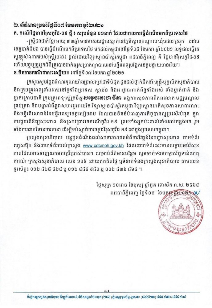 មានករណីវិជ្ជមានវីរុសកូវីដ-១៩ ថ្មី ចំនួន ០១នាក់ ជាពលករមកពីប្រទេសថៃ និងមិនមានអ្នកជាសះស្បេីយនោះទេ គិតត្រឹមថ្ងៃនេះ