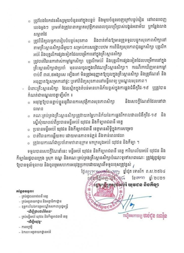ក្រសួងអប់រំ យុវជន និងកីឡា ចេញសេចក្តីណែនាំ ស្តីពីការអនុវត្តវិធានការសុវត្ថិភាពក្នុងបវេសនកាល ឆ្នាំសិក្សា ២០២០-២០២១ សម្រាប់គ្រឹះស្ថានសិក្សាចំណេះទូទៅសាធារណៈ