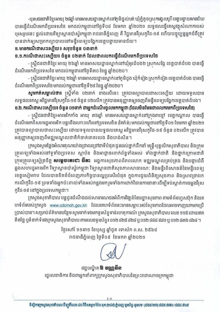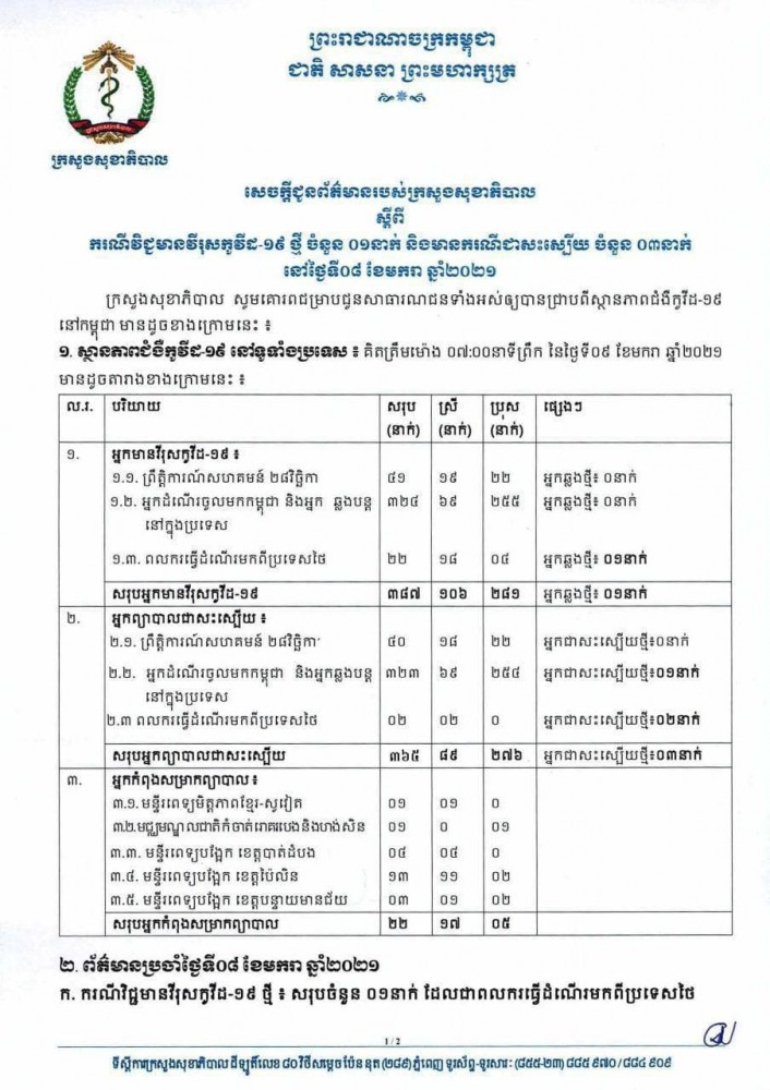 កម្ពុជា បន្តរកឃើញករណីវិជ្ជមានកូវីដ-១៩ ថ្មី ចំនួន ០១ករណី ដែលជាអ្នកដំណើរមកពីប្រទេសថៃ ខណៈមានករណីជាសះស្បើយចំនួន ០៣នាក់ គិតត្រឹមថ្ងៃនេះ