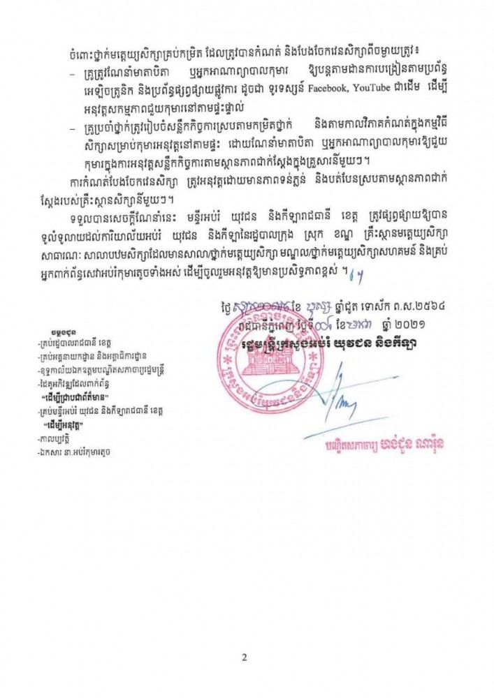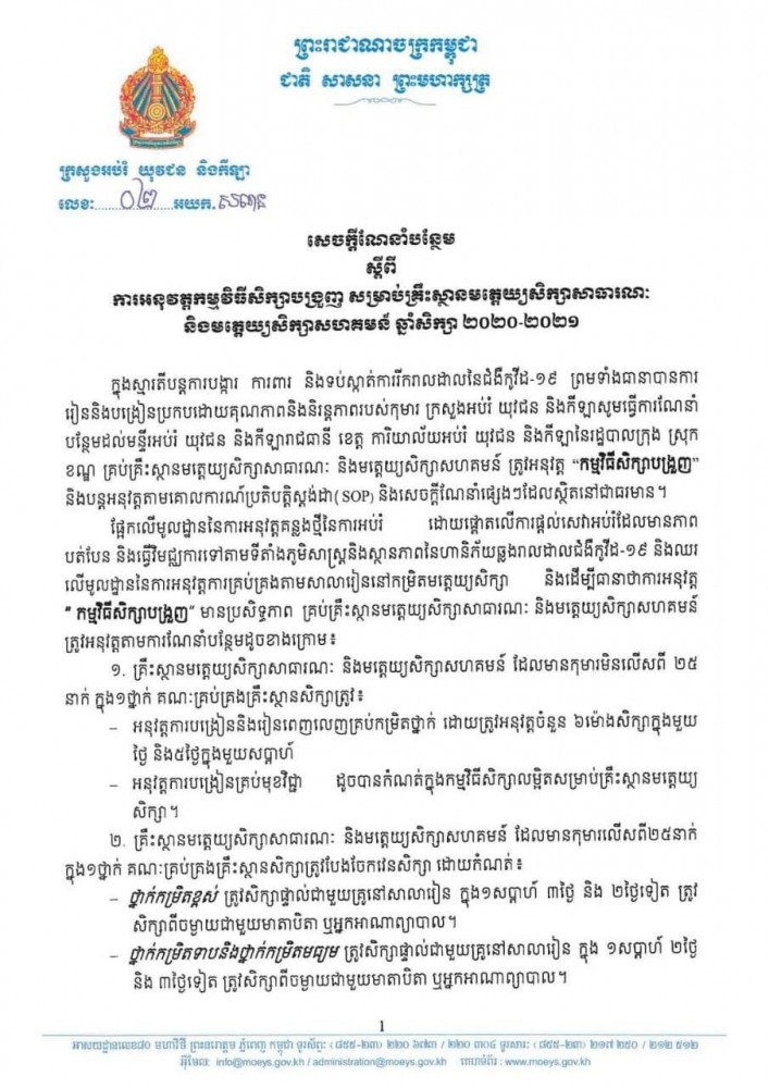 ក្រសួងអប់រំ ណែនាំបន្ថែមស្តីពីការអនុវត្តកម្មវិធីសិក្សាបង្រួញ សម្រាប់គ្រឹះស្ថានមតេ្តយ្យសិក្សាសាធារណ: និងមត្តេយ្យសិក្សាសហគមន៍ ឆ្នាំសិក្សា២០២០-២០២១