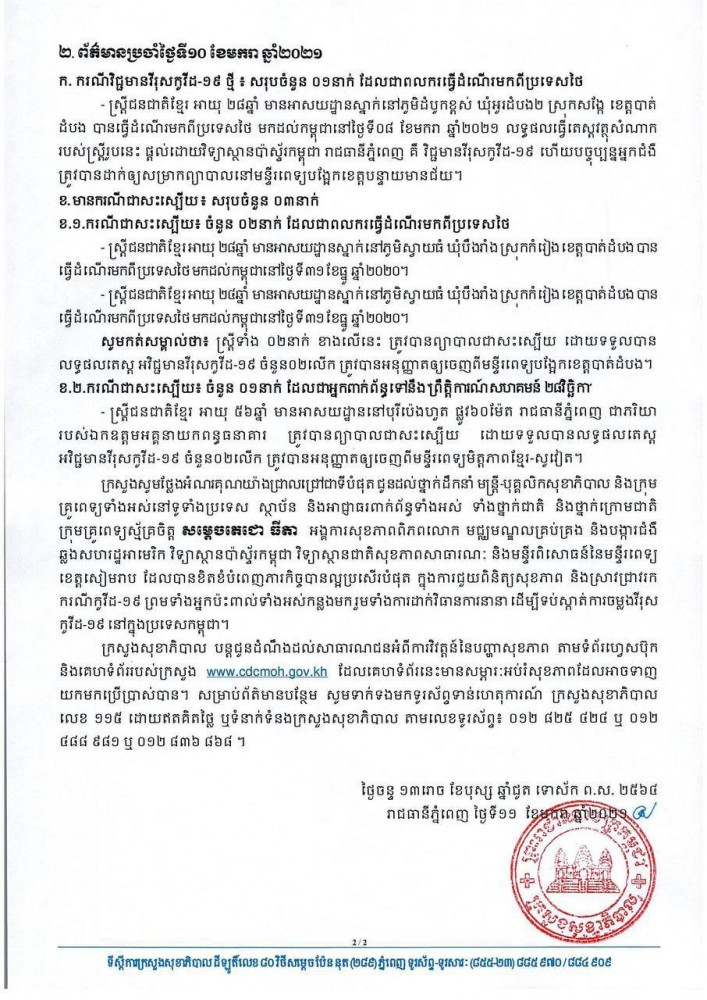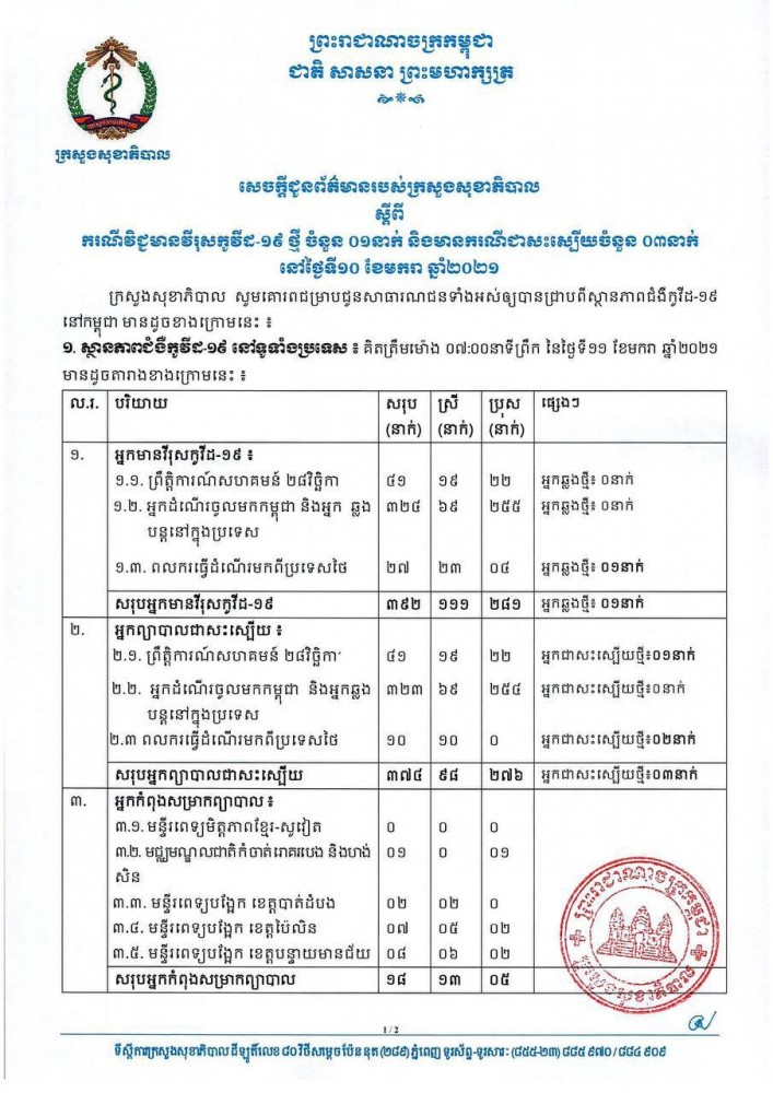 កម្ពុជា បន្តរកឃើញករណីវិជ្ជមានកូវីដ-១៩ ថ្មី ចំនួន ០១ករណី ដែលជាពលករមកពីប្រទេសថៃ ខណៈមានករណីជាសះស្បើយចំនួន ០៣នាក់ គិតត្រឹមថ្ងៃនេះ