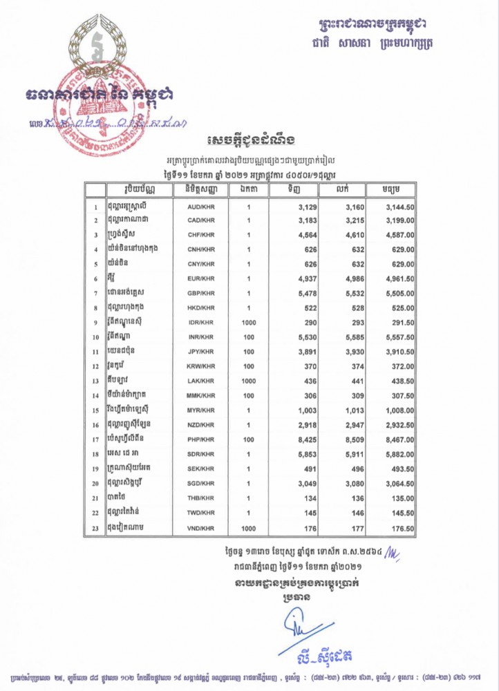អត្រាប្តូរប្រាក់រវាងរូបីយប័ណ្ណផ្សេងៗជាមួយប្រាក់រៀល សម្រាប់ថ្ងៃទី១១ ខែមករា ឆ្នាំ២០២១