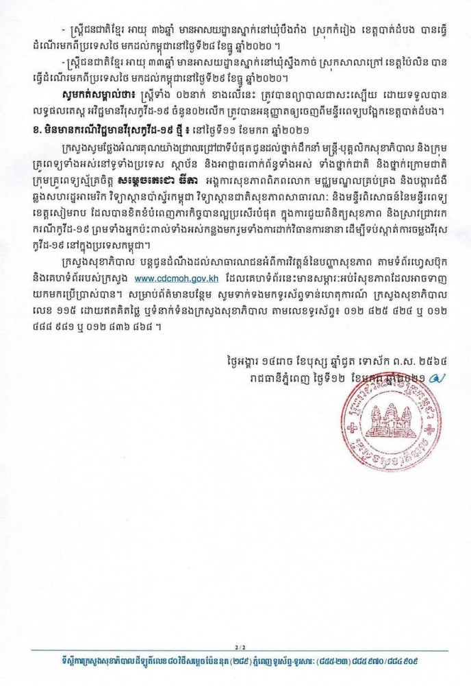 មិនមានករណីវិជ្ជមានកូវីដ-១៩ ថ្មីនោះទេ ខណៈមានការជាសះស្បើយចំនួន ០២នាក់ ដែលជាពលករមកពីប្រទេសថៃ