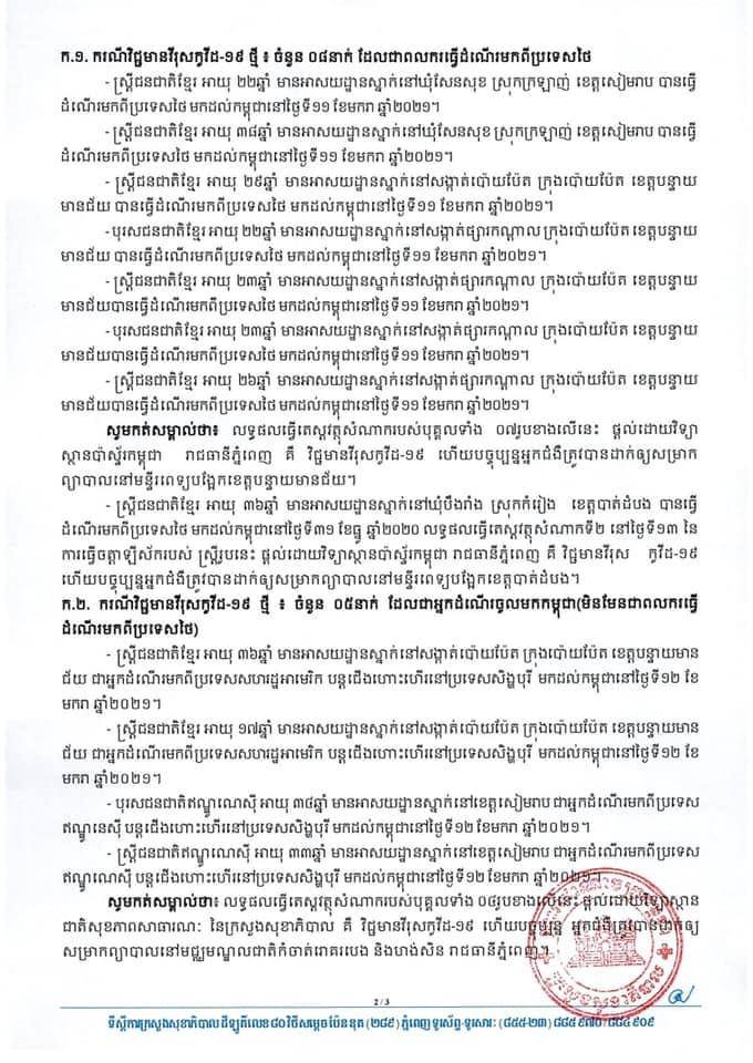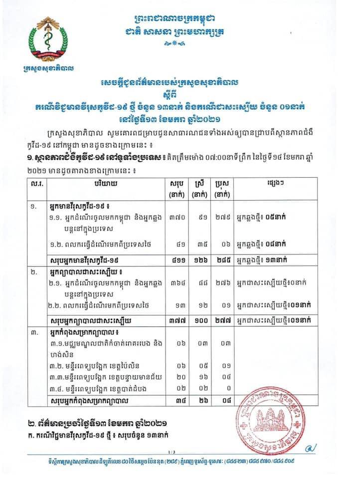 មានករណីវិជ្ជមានវីរុសកូវីដ-១៩ ថ្មី ចំនួន ១៣នាក់ និងមានអ្នកជាសះស្បេីយចំនួន ០១នាក់ គិតត្រឹមថ្ងៃនេះ