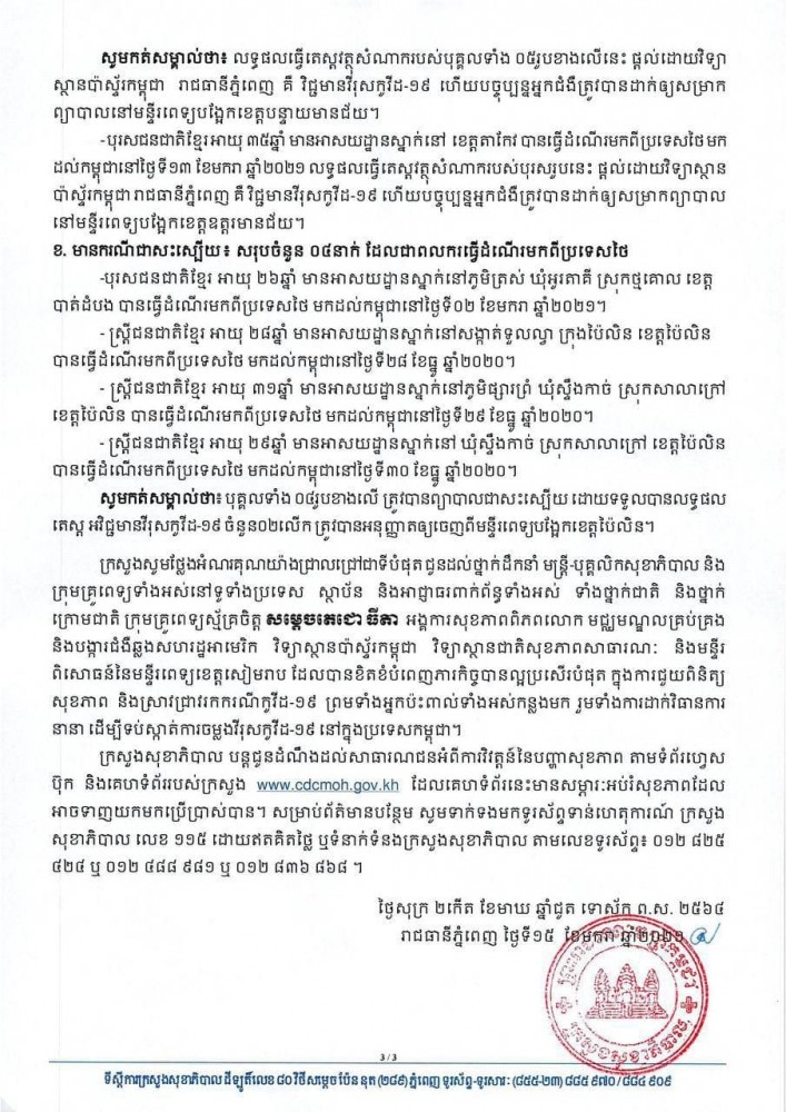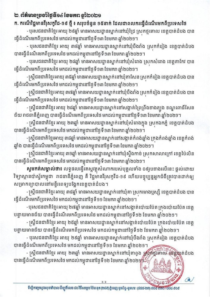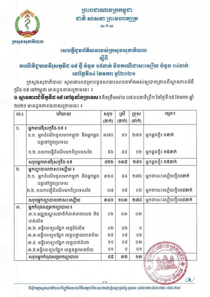 មានករណីវិជ្ជមានវីរុសកូវីដ-១៩ ថ្មី ចំនួន ១៥នាក់ ដែលជាពលករមកពីប្រទេសថៃ និងមានអ្នកជាសះស្បេីយចំនួន ០ ៤នាក់ គិតត្រឹមថ្ងៃនេះ