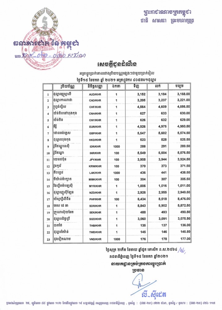 អត្រាប្តូរប្រាក់រវាងរូបីយប័ណ្ណផ្សេងៗជាមួយប្រាក់រៀល សម្រាប់ថ្ងៃទី១៥ ខែមករា ឆ្នាំ២០២១