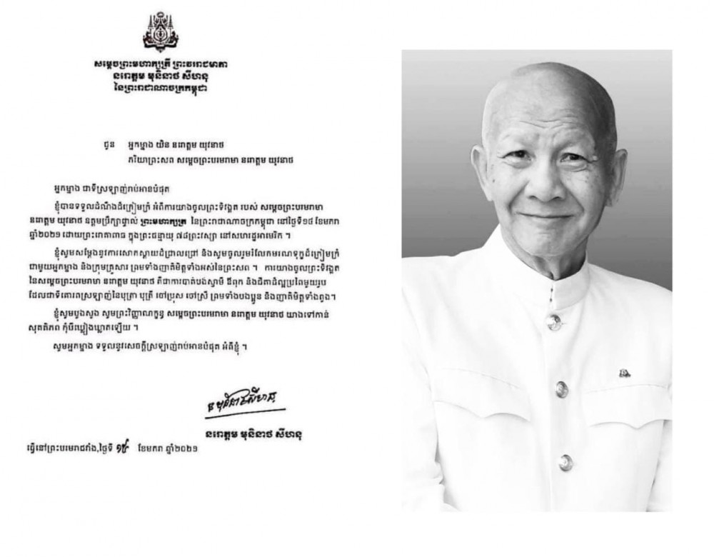 សម្តេចព្រះមហាក្សត្រី ផ្ញើព្រះរាជសាររំលែកព្រះមរណទុក្ខ ចំពោះការយាងចូលព្រះទិវង្គតរបស់ សម្តេចព្រះបរមរាមា នរោត្តម យុវនាថ ឧត្តមប្រឹក្សាផ្ទាល់ព្រះមហាក្សត្រ