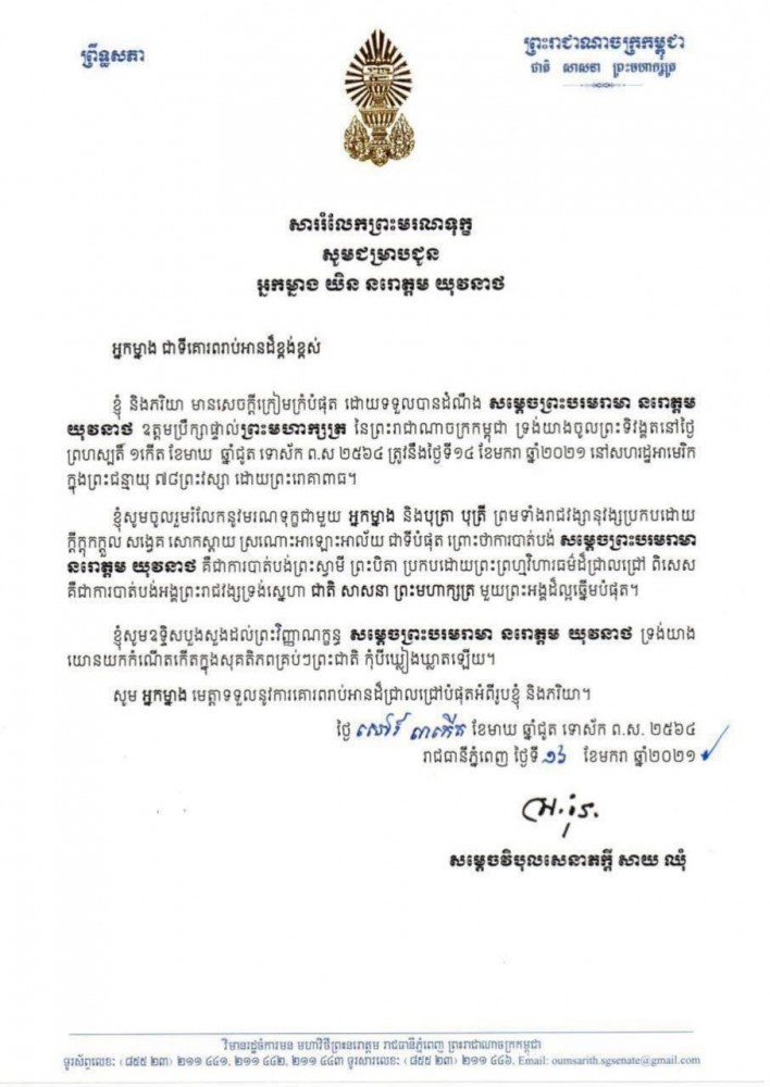 សម្តេចប្រធានព្រឹទ្ធសភា ផ្ញើសាររំលែកព្រះមរណទុក្ខ ចំពោះការយាងចូលព្រះទិវង្គតរបស់ សម្តេចព្រះបរមរាមា នរោត្តម យុវនាថ ឧត្តមប្រឹក្សាផ្ទាល់ព្រះមហាក្សត្រ