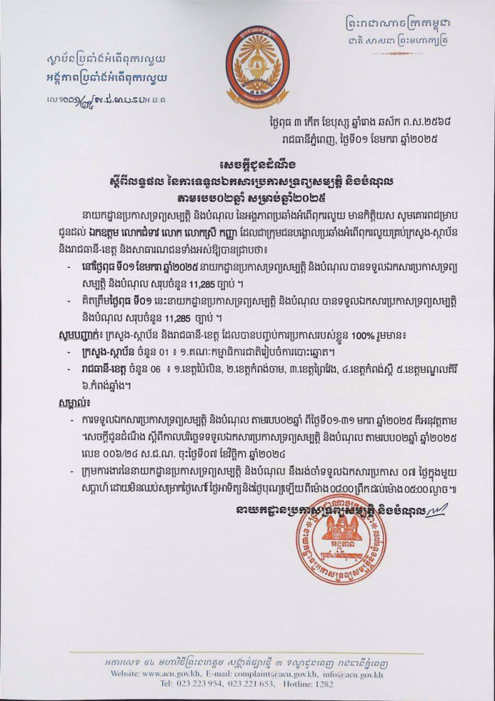 AKP ភ្នំពេញ ថ្ងៃទី០២ ខែមករា ឆ្នាំ២០២៥--គិតត្រឹមថ្ងៃទី០១ ខែមករា ឆ្នាំ២០២៥ នាយកដ្ឋានប្រកាសទ្រព្យសម្បត្តិ និងបំណុល បានទទួលឯកសារប្រកាសទ្រព្យសម្បត្តិ និងបំណុល សរុបចំនួន១១២៨៥ច្បាប់។ នេះបើតាមការបញ្ជាក់ឱ្យដឹងពីសំណាក់អង្គភាពប្រឆាំងអំពើពុករលួយ។ យោងតាមសេចក្តីជូនដំណឹងរបស់អង្គភាពប្រឆាំងអំពើពុករលួយនៅថ្ងៃទី០១ ខែមករា ឆ្នាំ ២០២៥ បានបញ្ជាក់ឱ្យដឹងថា ក្រុមការងារនៃនាយកដ្ឋានប្រកាសទ្រព្យសម្បត្តិ និងបំណុល នឹងរង់ចាំទទួលឯកសារប្រកាស៧ថ្ងៃក្នុងមួយសប្តាហ៍ ដោយមិនឈប់សម្រាកថ្ងៃសៅរ៍-អាទិត្យ និងថ្ងៃបុណ្យឡើយ ចាប់ពីម៉ោង០៨៖០០ព្រឹក ដល់ម៉ោង០៥៖០០ល្ងាច។