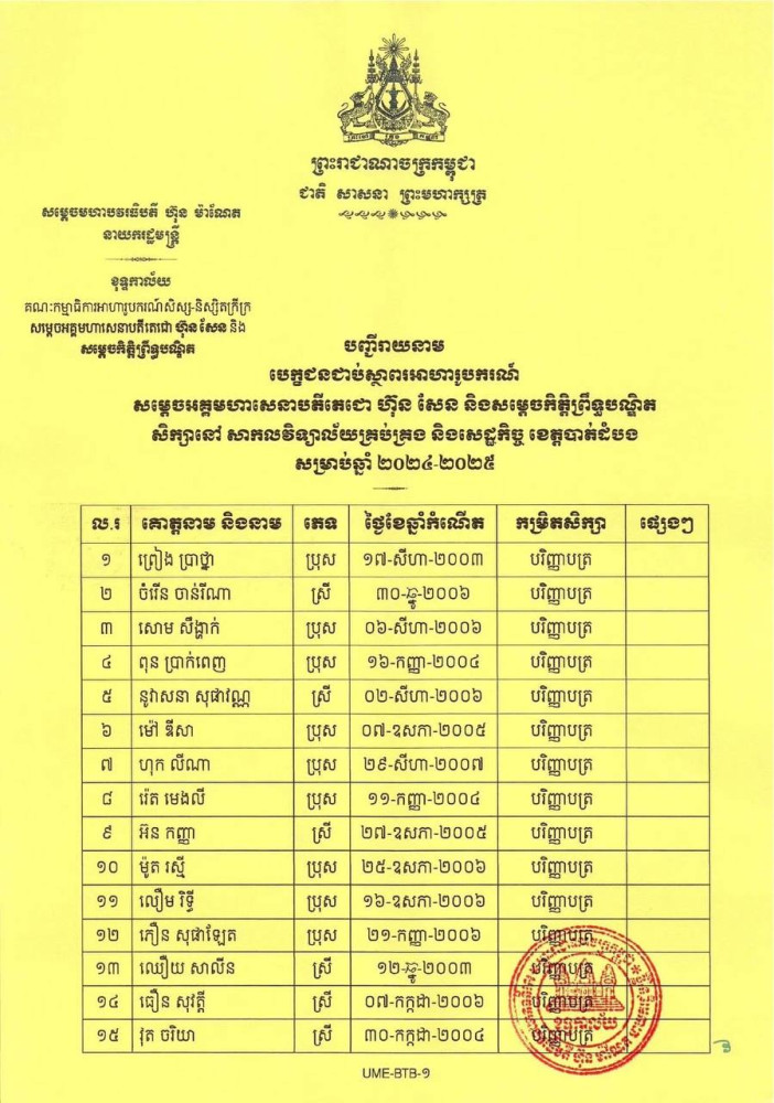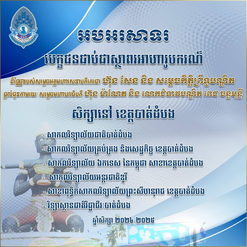 – ដំណាក់កាលទី២៖ ត្រូវដាក់ពាក្យចូលរៀននៅគ្រឹះស្ថានឧត្តមសិក្សាក្នុងខេត្តបាត់ដំបង។