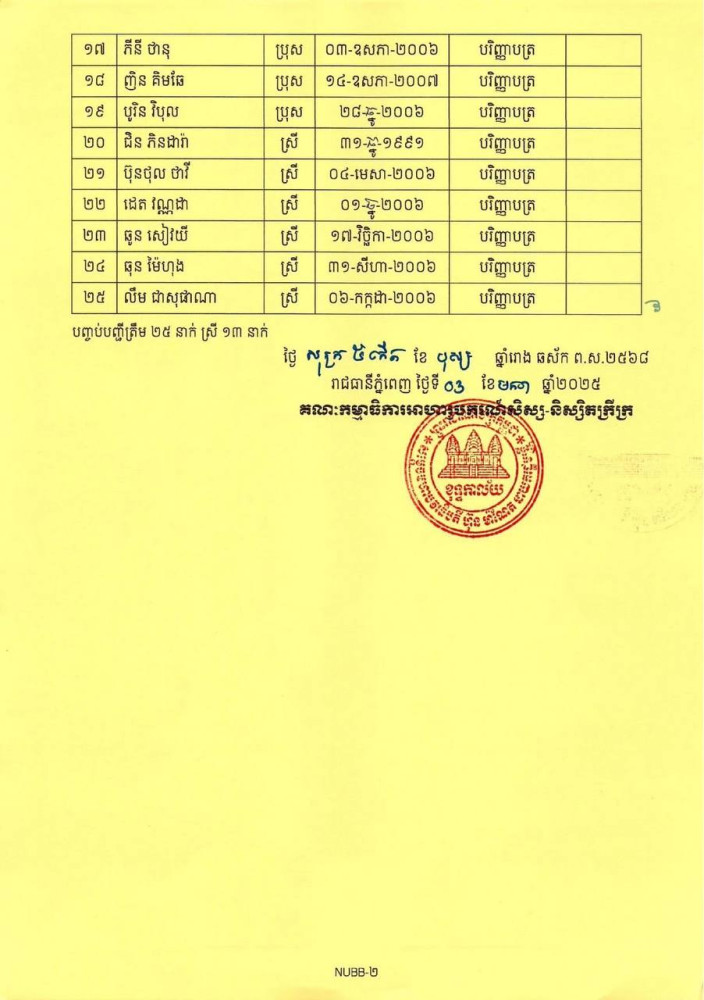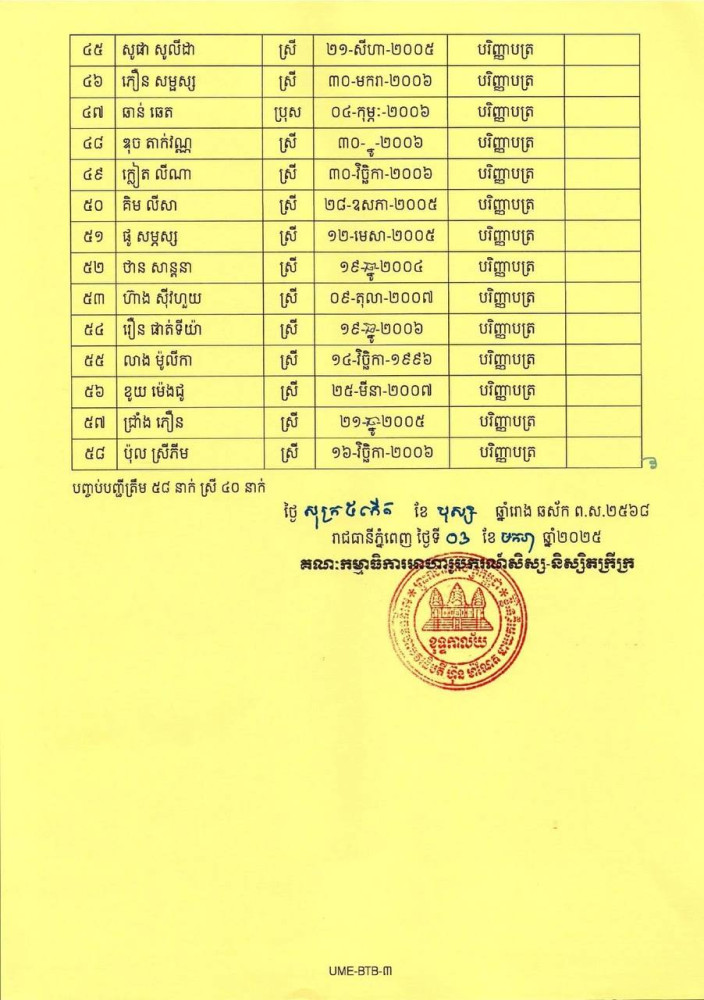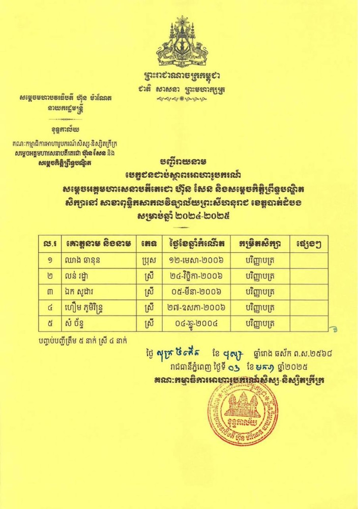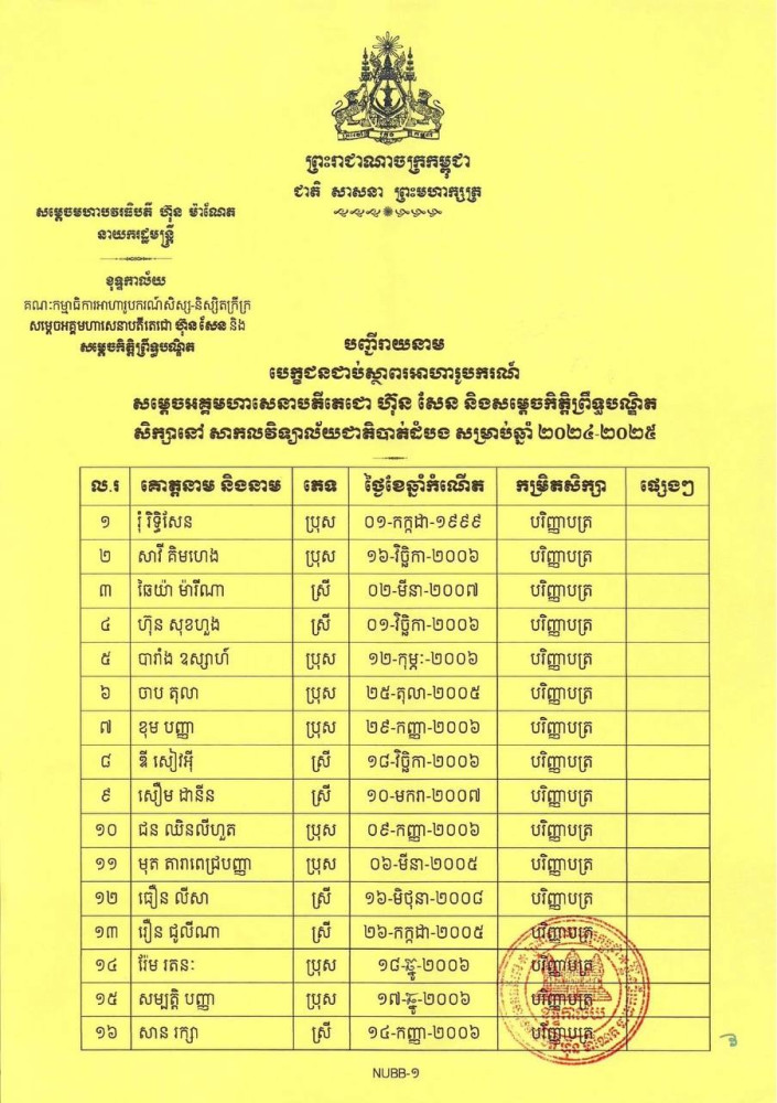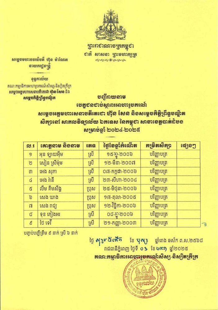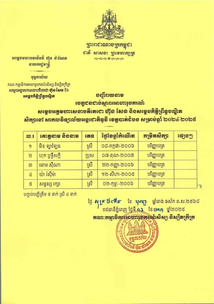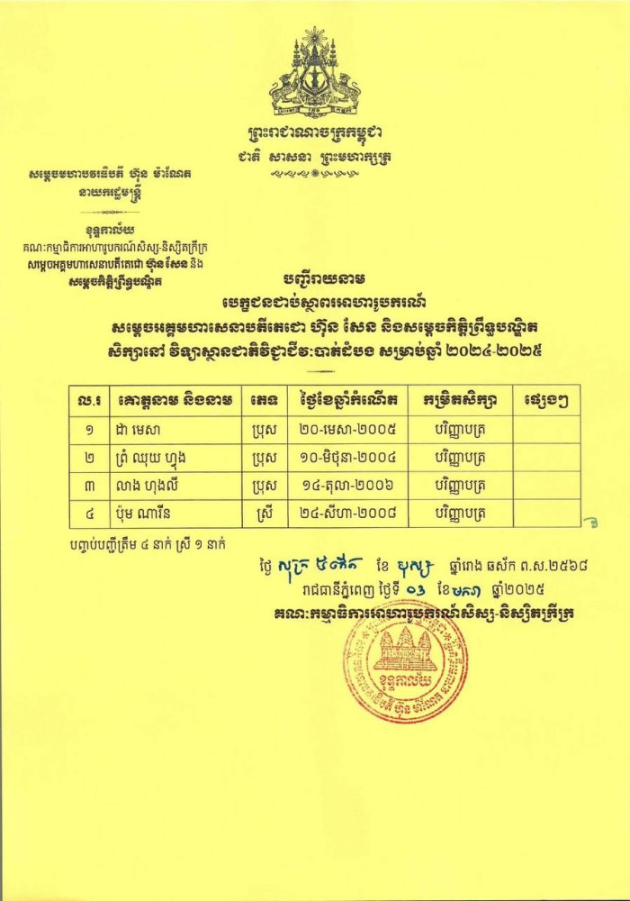 បេក្ខជនជាប់ស្ថាពរ ត្រូវបន្តនីតិវិធីដើម្បីចូលសិក្សាត្រឹមថ្ងៃទី៩ ខែមករា ឆ្នាំ២០២៥ វេលាម៉ោង ១៧:០០ ជាកំហិត។ ករណីបេក្ខជនជាប់ស្ថាពរ ពុំបានមកបង្ហាញខ្លួន និងដាក់ពាក្យចូលរៀនតាមកាលបរិច្ឆេទដូចបានកំណត់ គណៈកម្មាធិការចាត់ទុកថាបេក្ខជនបោះបង់សិទ្ធិទទួលអាហារូបករណ៍៕
