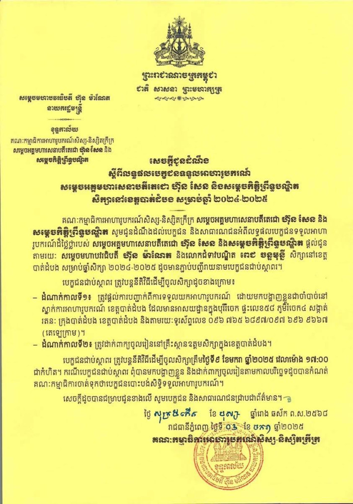 – ដំណាក់កាលទី១៖ ត្រូវផ្តល់ការបញ្ជាក់ពីការទទួលយកអាហារូបករណ៍ ដោយមកបង្ហាញខ្លួនជាចាំបាច់នៅស្នាក់ការអាហារូបករណ៍ ខេត្តបាត់ដំបង ដែលមានអាសយដ្ឋានក្នុងបុរីរំចេក ផ្ទះលេខ៥៨ ភូមិរំចេក៤ សង្កាត់រតនៈ ក្រុងបាត់ដំបង ខេត្តបាត់ដំបង និងតាមរយៈទូរស័ព្ទលេខ ០៩៦ ៧៦៥ ៦៨៩៧/ ០៩៧ ៦៩៦ ៩៦៦៧ (តេឡេក្រាម)។