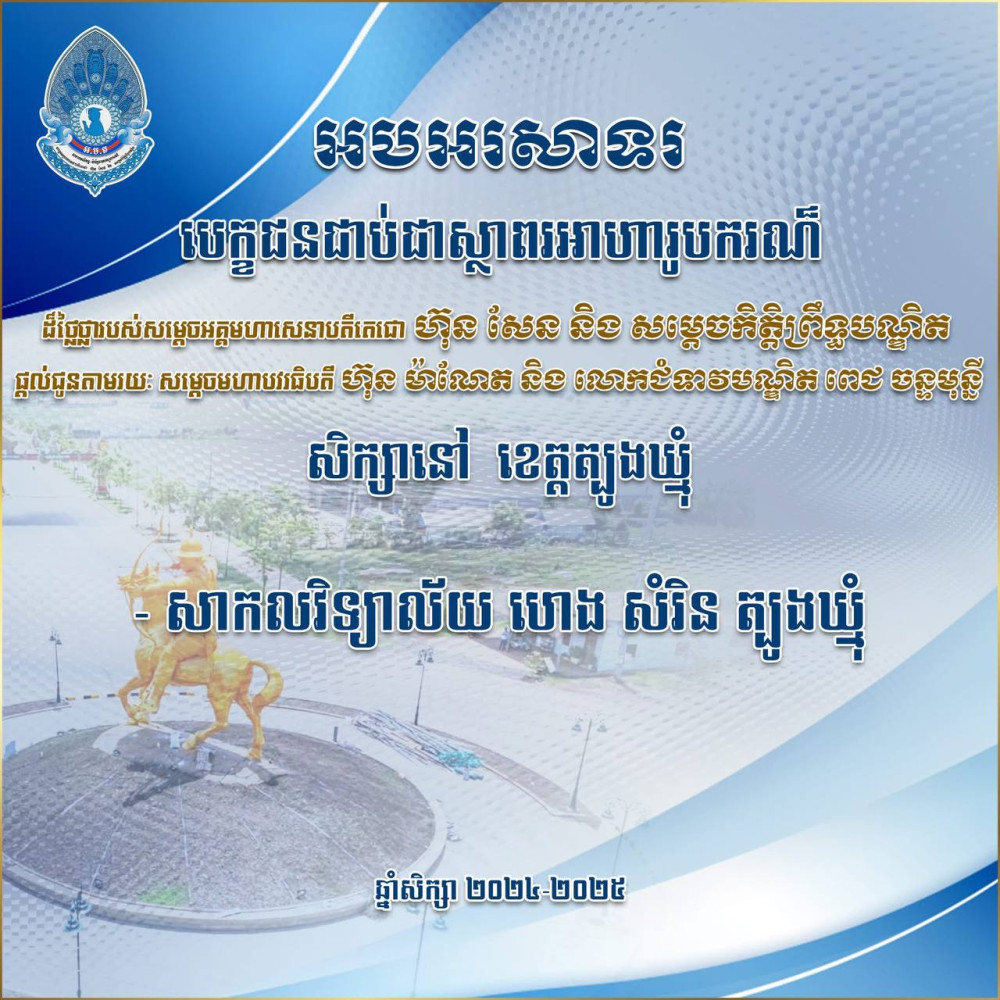 អបអរសាទរបេក្ខជនជាប់ស្ថាពរទទួលបានអាហារូបករណ៍ សម្តេចអគ្គមហាសេនាបតីតេជោ ហ៊ុន សែន និងសម្តេចកិត្តិព្រឹទ្ធបណ្ឌិត ផ្តល់ជូនតាមរយៈ សម្តេចមហាបវរធិបតី ហ៊ុន ម៉ាណែត និងលោកជំទាវបណ្ឌិត ពេជ ចន្ទមុន្នី សិក្សានៅខេត្តត្បូងឃ្មុំ សម្រាប់ឆ្នាំ ២០២៤-២០២៥