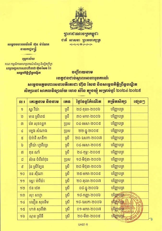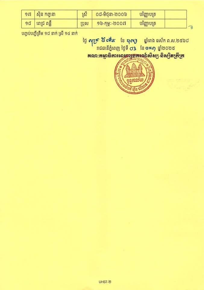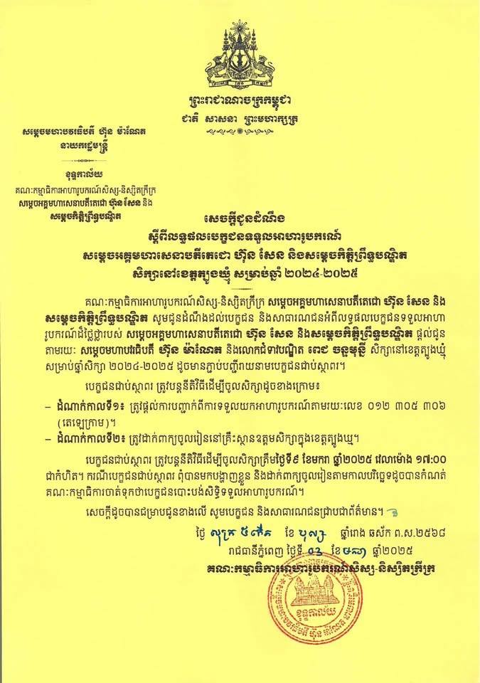 បេក្ខជនជាប់ស្ថាពរ ត្រូវបន្តនីតិវិធីដើម្បីចូលសិក្សាត្រឹមថ្ងៃទី៩ ខែមករា ឆ្នាំ២០២៥ វេលាម៉ោង ១៧:០០ ជាកំហិត។ ករណីបេក្ខជនជាប់ស្ថាពរ ពុំបានមកបង្ហាញខ្លួន និងដាក់ពាក្យចូលរៀនតាមកាលបរិច្ឆេទដូចបានកំណត់ គណៈកម្មាធិការចាត់ទុកថាបេក្ខជនបោះបង់សិទ្ធិទទួលអាហារូបករណ៍៕