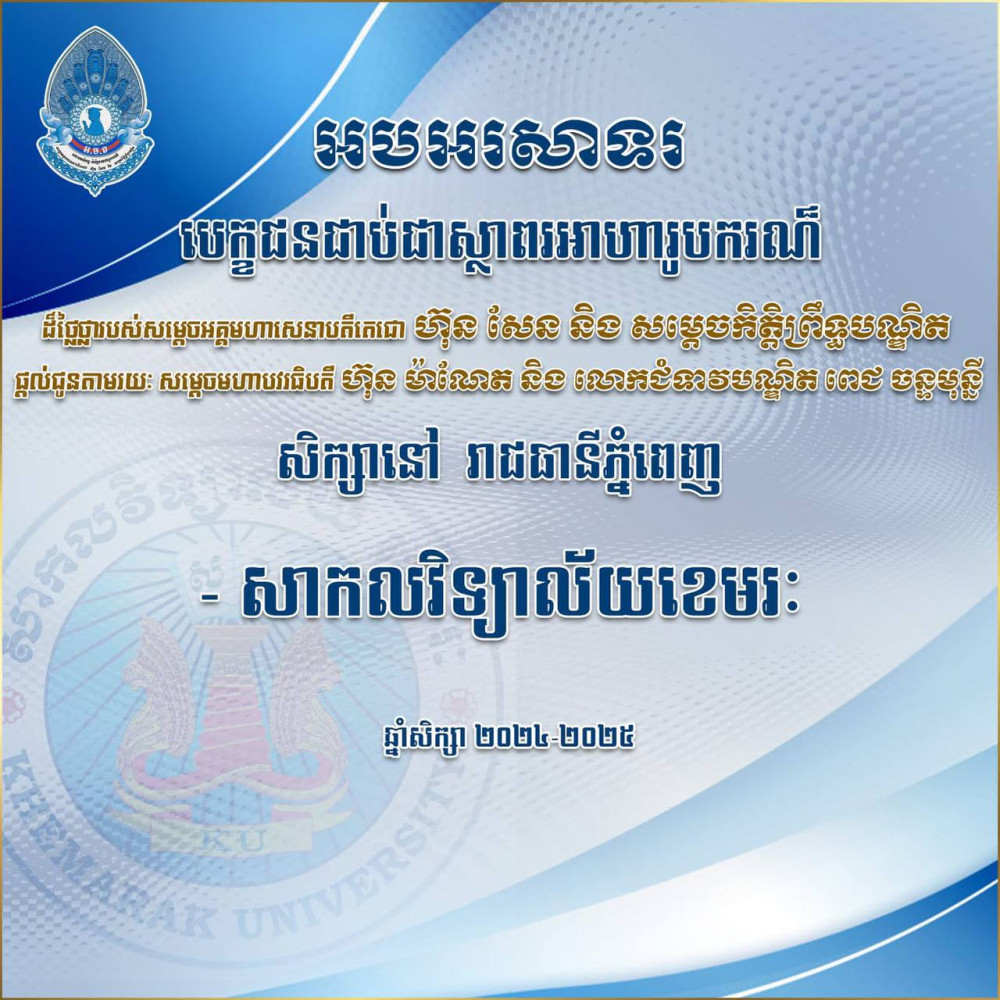 AKP ភ្នំពេញ ថ្ងៃទី០៤ ខែមករា ឆ្នាំ២០២៥ – សម្ដេចមហាបវរធិបតី ហ៊ុន ម៉ាណែត នាយករដ្ឋមន្ត្រីនៃព្រះរាជាណាចក្រកម្ពុជា អបអរសាទរបេក្ខជនជាប់ស្ថាពរទទួលបានអាហារូបករណ៍ សម្តេចអគ្គមហាសេនាបតីតេជោ ហ៊ុន សែន និងសម្តេចកិត្តិព្រឹទ្ធបណ្ឌិត ផ្តល់ជូនតាមរយៈ សម្តេចមហាបវរធិបតី ហ៊ុន ម៉ាណែត និងលោកជំទាវបណ្ឌិត ពេជ ចន្ទមុន្នី ថ្នាក់បរិញ្ញាបត្រជាន់ខ្ពស់ សិក្សានៅសាកលវិទ្យាល័យខេមរៈ សម្រាប់ឆ្នាំ ២០២៤-២០២៥។