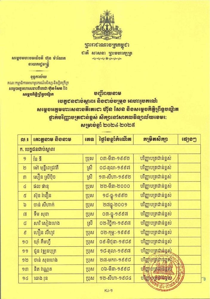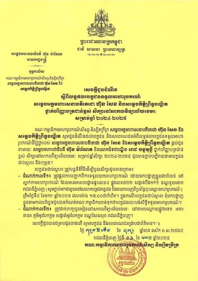 – ដំណាក់កាលទី១៖ ត្រូវផ្តល់ការបញ្ជាក់ពីការទទួលយកអាហារូបករណ៍ ដោយមកបង្ហាញខ្លួនជាចាំបាច់ នៅស្នាក់ការអាហារូបករណ៍ ដែលមានអាសយដ្ឋានផ្ទះលេខ៤ ផ្លូវលេខ៥២២ សង្កាត់បឹងកក់១ ខណ្ឌទួលគោក រាជធានីភ្នំពេញ (សូមភ្ជាប់មកជាមួយនៅសលាកបត្រឯកត្តជន ដែលយកចេញពីប្រព័ន្ធចុះឈ្មោះអាហារូបករណ៍) ត្រឹមថ្ងៃទី៨ ខែមករា ឆ្នាំ២០២៥ វេលាម៉ោង ១៧:០០ជាកំហិត។ ក្នុងករណីបេក្ខជនជាប់ស្ថាពរ ពុំមកបង្ហាញខ្លួនតាមកាលបរិច្ឆេទដូចបានកំណត់គណៈកម្មាធិការចាត់ទុកថាបេក្ខជនបោះបង់សិទ្ធិទទួលអាហារូបករណ៍។