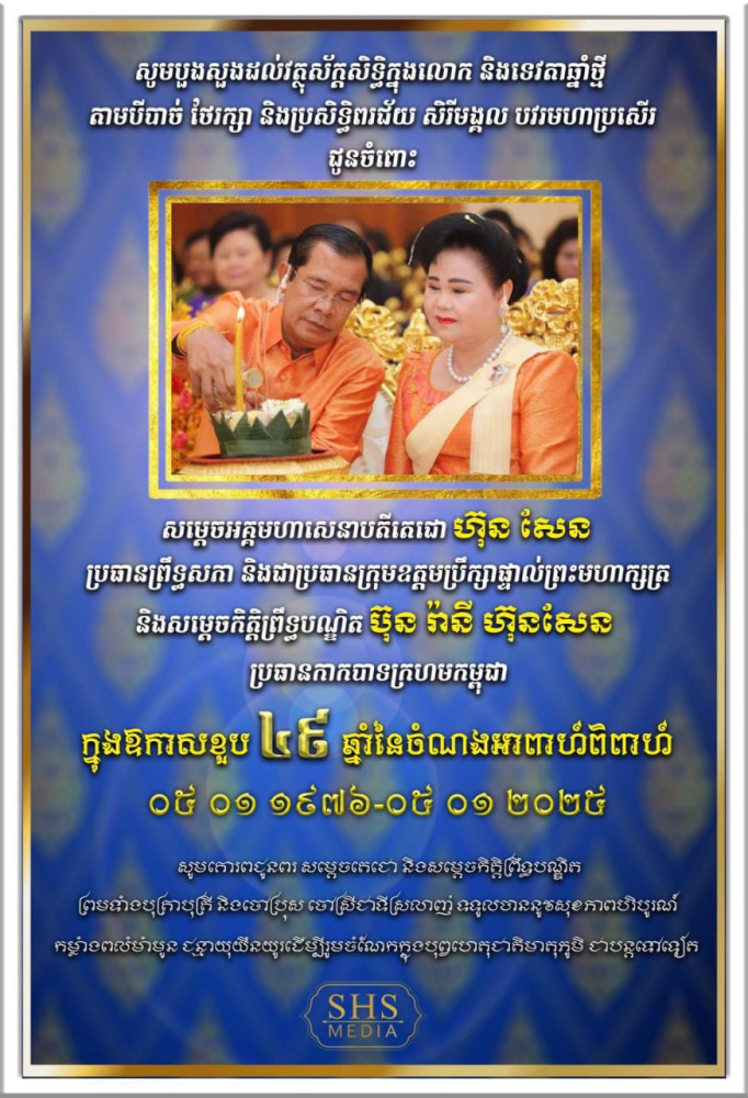 AKP ភ្នំពេញ ថ្ងៃទី០៥ ខែមករា ឆ្នាំ២០២៥ -- សម្ដេចអគ្គមហាសេនាបតីតេជោ ហ៊ុន សែន ប្រធានព្រឹទ្ធសភា នៃព្រះរាជាណាចក្រកម្ពុជា បានរម្លឹកកាលពី៤៩ឆ្នាំមុន នៃជីវិតអាពាហ៍ពិពាហ៍សម្តេចកិត្តិព្រឹទ្ធបណ្ឌិត ប៊ុន រ៉ានី ហ៊ុនសែន ក្នុងរបបកម្ពុជាប្រជាធិបតេយ្យ (៥មករា១៩៧៦.៥មករា២០២៥)។