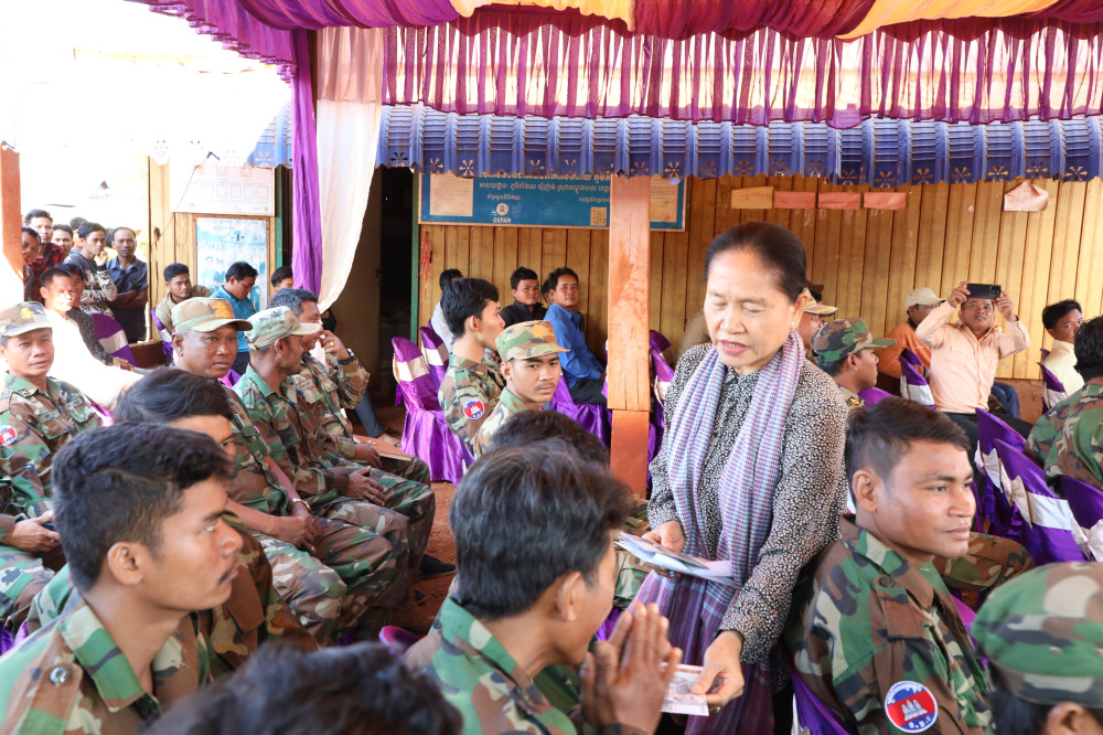 គណៈប្រតិភូរដ្ឋសភាបាន នាំយកអំណោយរបស់សម្តេចមហារដ្ឋសភាធិការបតី ឃួន សុដារី ចែកជូនកងកម្លាំងវិស្វកម្មនៃកងយោធពលខេមរភូមិន្ទ ដែលកំពុងឈរជើងកសាងស្ថាបនាផ្លូវតាមក្រវាត់ព្រំដែនកម្ពុជា-វៀតណាម ផងដែរ។ គ្រឿងឧបភោគបរិភោគ ដែលគណៈកម្មការបានចែកជូនកងកម្លាំងវិស្វកម្មរួមមាន ទឹកសុទ្ធ៣០កេស, ត្រីខ១៥កេស, ថ្នាំពេទ្យ២៥ ប្រអប់, គុយទាវ និងមីសួ៣០កេស,ត្រីងៀត១៥គីឡូក្រាម និងថវិកា៣លានរៀល, ជូនវរៈសេនាតូចនគរបាលការពារព្រំដែនលេខ២០៣ ចំនួន២លានរៀល, ជូនសាលាស្រុកអណ្តូងមាស៥០ម៉ឺនរៀល, ជូនសាលាឃុំ២០ម៉ឺនរៀល, ជូនកងកម្លាំងទាំង៣នូវថវិកា៦០ម៉ឺនរៀលនិងប្រជាពលរដ្ឋចូលរួម៦៨នាក់ក្នុងម្នាក់១ម៉ឺនរៀលផងដែរ។ដោយឡែករដ្ឋបាលខេត្ត បានឧបត្ថម្ភអង្ករ២តោន ថវិកា៥០០ដុល្លារ និងថ្នាំប៉ារ៉ា២កេស។