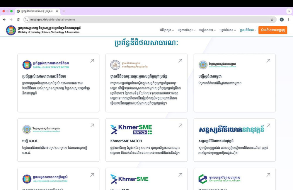 AKP ភ្នំពេញ ថ្ងៃទី០៧ ខែមករា ឆ្នាំ២០២៥–ក្រសួងឧស្សាហកម្ម វិទ្យាសាស្ត្រ បច្ចេកវិទ្យា និងនវានុវត្តន៍ បានដាក់ឱ្យដំណើរការសេវាសាធារណៈចំនួន ៧ បន្ថែមទៀត នៅលើប្រព័ន្ធផ្តល់សេវាសាធារណៈឌីជីថល ក្នុងគោលដៅបង្កើនភាពងាយស្រួល ប្រសិទ្ធភាព និងតម្លាភាពនៃការផ្តល់ និងការទទួលសេវាសាធារណៈរបស់ក្រសួង។ ការផ្លាស់ប្តូរពីការផ្តល់សេវាតាមបែបប្រពៃណីមកជាសេវាតាមប្រព័ន្ធអនឡាញនេះ បង្ហាញពីការប្តេជ្ញាចិត្តរបស់ក្រសួង ក្នុងការធ្វើទំនើបកម្មសេវាសាធារណៈ និងកាត់បន្ថយការលំបាកសម្រាប់ប្រជាពលរដ្ឋ និងធុរជន។