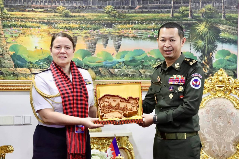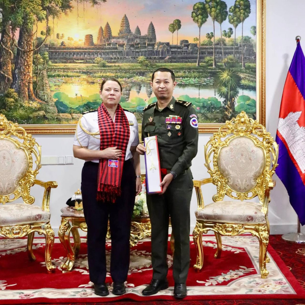 AKP ភ្នំពេញ ថ្ងៃទី០៩ ខែមករា ឆ្នាំ២០២៥ -- ឯកឧត្តម ឧត្តមសេនីយ៍ទោ សែម រតនា អនុប្រធានទី១គណៈកម្មាធិការជាតិ និងជាអគ្គនាយកស្តីទីមជ្ឈមណ្ឌលជាតិរក្សាសន្តិភាព បានអនុញ្ញាតឱ្យលោកស្រី វរនាវីឯក Anne Brun អនុព័ន្ធយោធាអមស្ថានទូតបារាំងប្រចាំកម្ពុជា ដែលមាននិវេសនដ្ឋាននៅរដ្ឋធានីហាណូយ ប្រទេសវៀតណាម ចូលជួបពិភាក្សាការងារ នាថ្ងៃទី០៩ ខែមករា ឆ្នាំ២០២៥ នៅទីស្តីការមជ្ឈមណ្ឌលជាតិ។