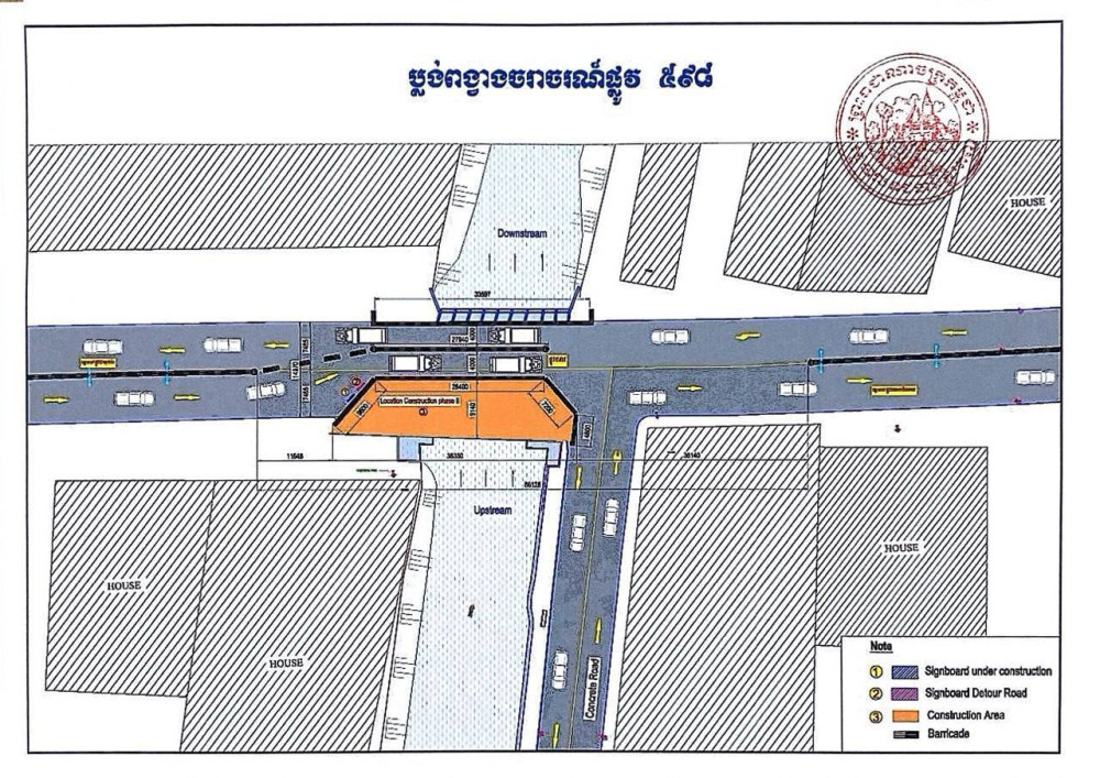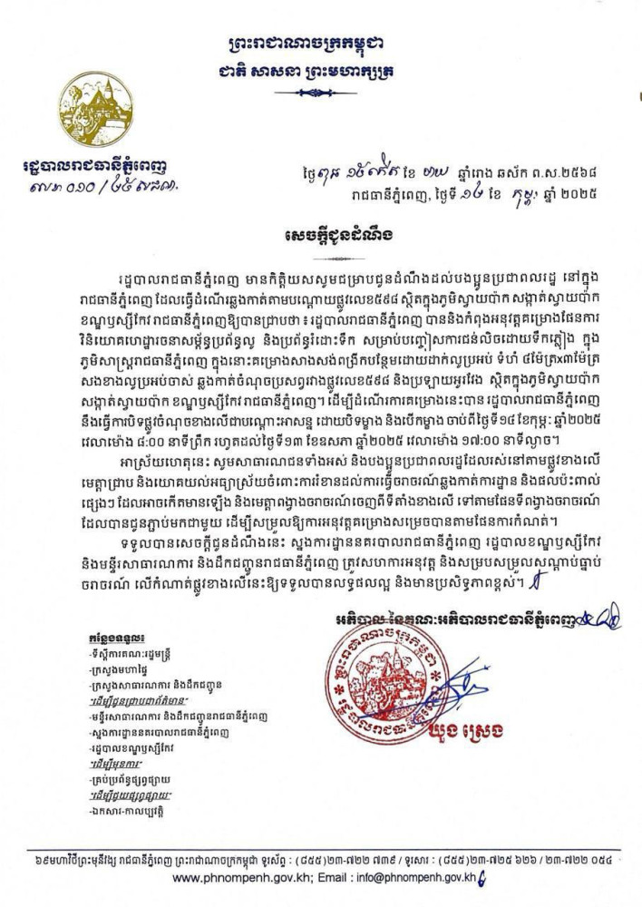 អាស្រ័យហេតុនេះ សាធារណជនទាំងអស់ និងបងប្អូនប្រជាពលរដ្ឋដែលរស់នៅតាមផ្លូវខាងលើ សូមយោគយល់អធ្យាស្រ័យចំពោះការរំខានដល់ការធ្វើចរាចរណ៍ឆ្លងកាត់ការដ្ឋាន និងផលប៉ះពាល់ផ្សេងៗ ដែលអាចកើតមានឡើង និងមេត្តាពង្វាងចរាចរណ៍ចេញពីទីតាំងខាងលើ ទៅតាមផែនទីពង្វាងចរាចរណ៍ ដែលបានជូនភ្ជាប់មកជាមួយ ដើម្បីសម្រួលឱ្យការអនុវត្តគម្រោងសម្រេចបានតាមផែនការកំណត់។