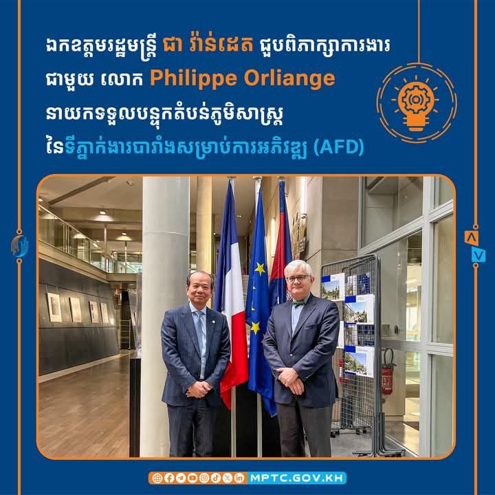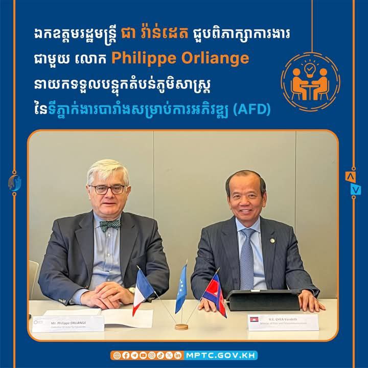 AKP ភ្នំពេញ ថ្ងៃទី១៣ ខែកុម្ភៈ ឆ្នាំ២០២៥ -- ឯកឧត្ដម ជា វ៉ាន់ដេត រដ្ឋមន្ត្រីក្រសួងប្រៃសណីយ៍ និងទូរគមនាគមន៍ (ក.ប.ទ.) កាលពីថ្ងៃទី១២ ខែកុម្ភៈ ឆ្នាំ២០២៥ បានជួបពិភាក្សាការងារជាមួយ លោក Philippe Orliange នាយកទទួលបន្ទុកតំបន់ភូមិសាស្ត្រនៃទីភ្នាក់ងារបារាំងសម្រាប់ការអភិវឌ្ឍ (AFD) នៅទីស្នាក់ការកណ្ដាល AFD។