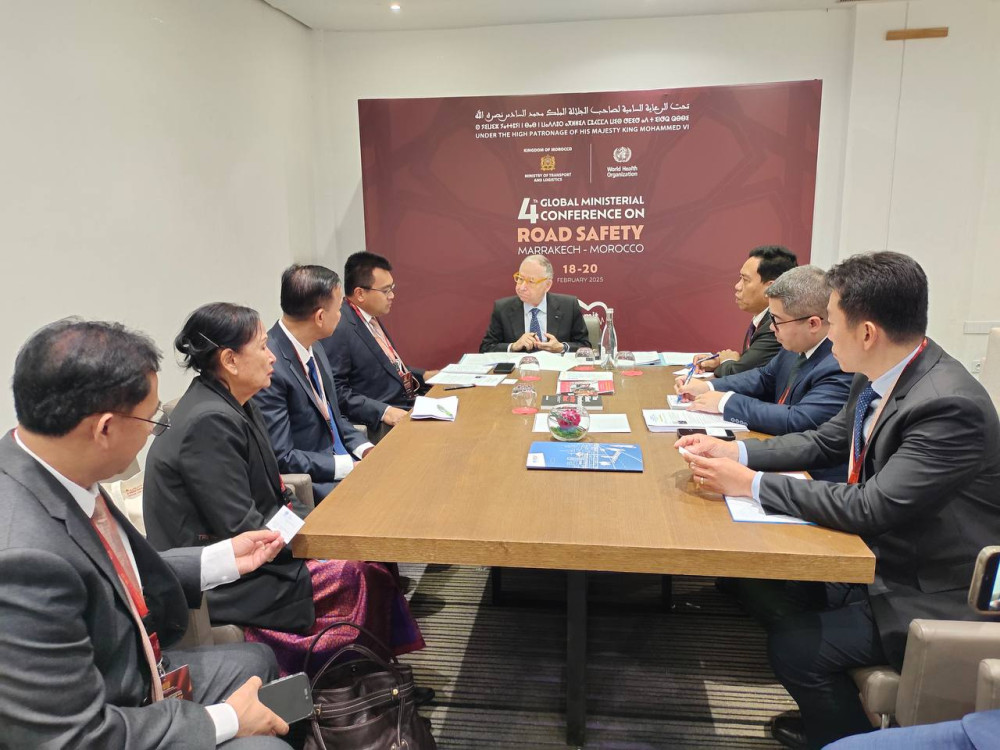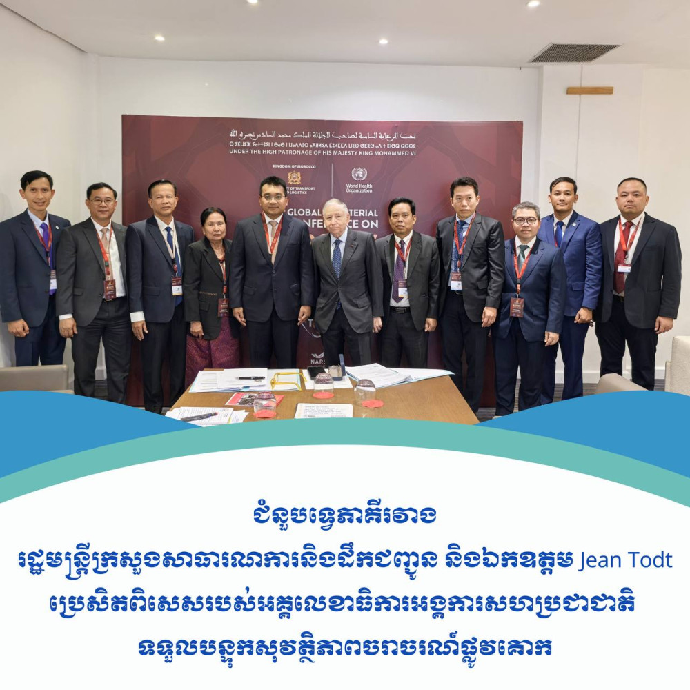 កាលពីរសៀលថ្ងៃពុធ ទី១៨ ខែកុម្ភៈ ឆ្នាំ២០២៥ ក្នុងឱកាសអញ្ជើញចូលរួមក្នុងសន្និសីទសកលថ្នាក់រដ្ឋមន្ត្រីស្តីពីសុវត្ថិភាពចរាចរណ៍ផ្លូវគោកលើកទី៤ ឯកឧត្តម ប៉េង ពោធិ៍នា រដ្ឋមន្ត្រីក្រសួងសាធារណការនិងដឹកជញ្ជូន និងជាអនុប្រធានអចិន្ត្រៃយ៍គណៈកម្មាធិការជាតិសុវត្ថិភាព ចរាចរណ៍ផ្លូវគោក បានដឹកនាំគណៈប្រតិភូកម្ពុជាជួបប្រជុំទ្វេភាគីជាមួយ ឯកឧត្តម Jean Todt ប្រេសិតពិសេសរបស់អគ្គលេខាធិការអង្គការសហប្រជាជាតិ ទទួលបន្ទុកសុវត្ថិភាពចរាចរណ៍ផ្លូវគោក ដើម្បីពិភាក្សាផ្លាស់ប្តូរយោបល់លើការងារពង្រឹងសុវត្ថិភាពចរាចរណ៍ផ្លូវគោក។