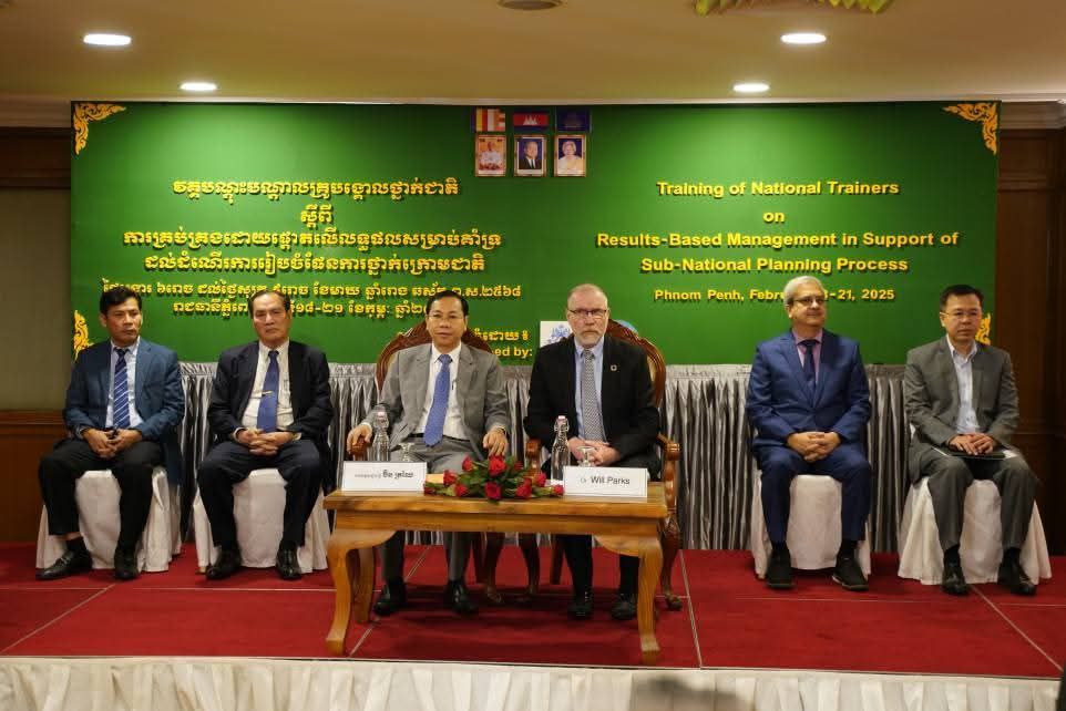 AKP ភ្នំពេញ ថ្ងៃទី១៩ ខែកុម្ភៈ ឆ្នាំ២០២៥-- ឯកឧត្តម ប៊ិន ត្រឈៃ រដ្ឋមន្ត្រីក្រសួងផែនការ បានអញ្ជើញជាអធិបតីក្នុងពិធីបើកវគ្គបណ្តុះបណ្តាលគ្រូបង្គោលថ្នាក់ជាតិស្តីពី ការគ្រប់គ្រងដោយផ្តោតលើលទ្ធផល សម្រាប់គាំទ្រដល់ដំណើរការរៀបចំផែនការថ្នាក់ក្រោមជាតិ នៅសណ្ឋាគារសាន់វេ (Sunway Hotel Phnom Penh) រាជធានីភ្នំពេញ កាលពីថ្ងៃទី១៨ ខែកុម្ភៈ ឆ្នាំ២០២៥។