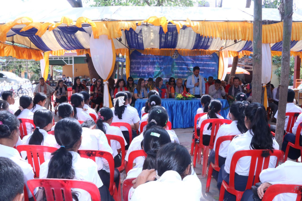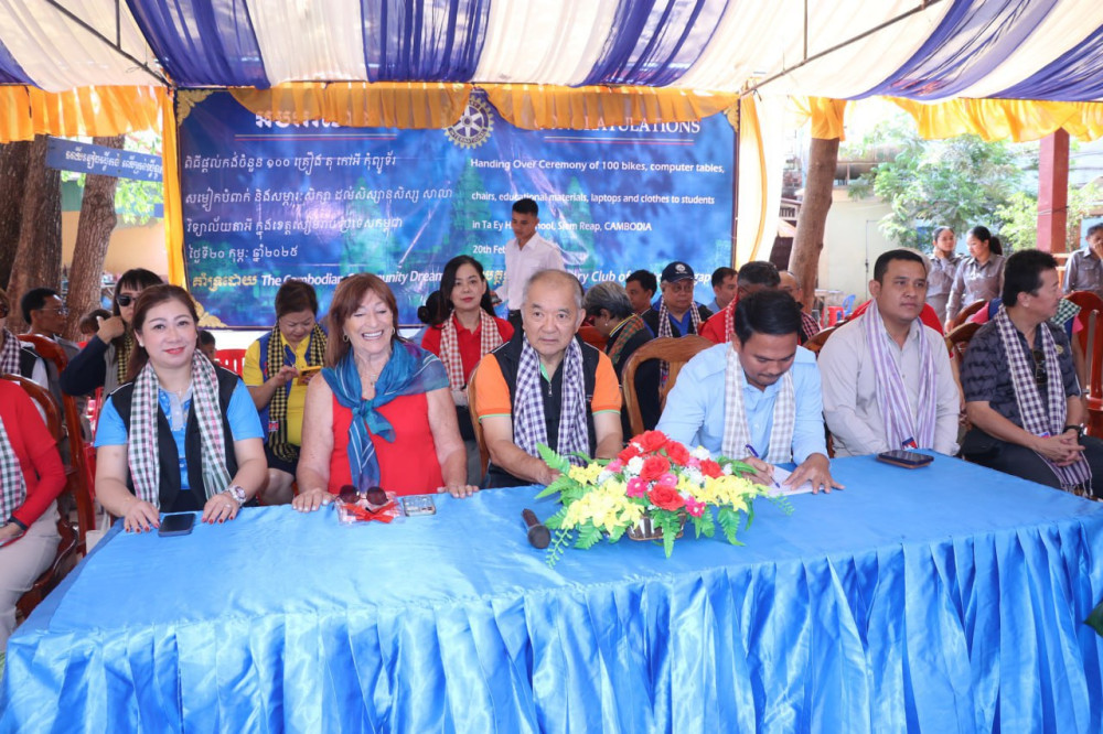 AKP សៀមរាប ថ្ងៃទី២០ ខែកុម្ភៈ ឆ្នាំ២០២៥ -- អង្គការរ៉ូតារីក្លឹប សិនតូសាសាំងហ្គាពួរ និងអង្គការសុបិន្តសហគមន៍កម្ពុជា បានសហការគ្នានាំយកអំណោយជាកុំព្យូទ័រចំនួន១៥គ្រឿង កង់១០០គ្រឿង រួមនឹងសម្ភារសិក្សា៥០០កញ្ចប់ និងសម្លៀកបំពាក់មួយចំនួនយកទៅចែកជូនដល់សិស្សានុសិស្សក្រីក្រដែលកំពុងសិក្សានៅក្នុងវិទ្យាល័យ តាអី ឃុំត្រពាំងធំ ស្រុកប្រាសាទបាគង ខេត្តសៀមរាប ដែលការនាំយកអំណោយទៅចែកនេះបានធ្វើឡើងនៅថ្ងៃទី២០ ខែកុម្ភៈ ឆ្នាំ២០២៥នេះ។