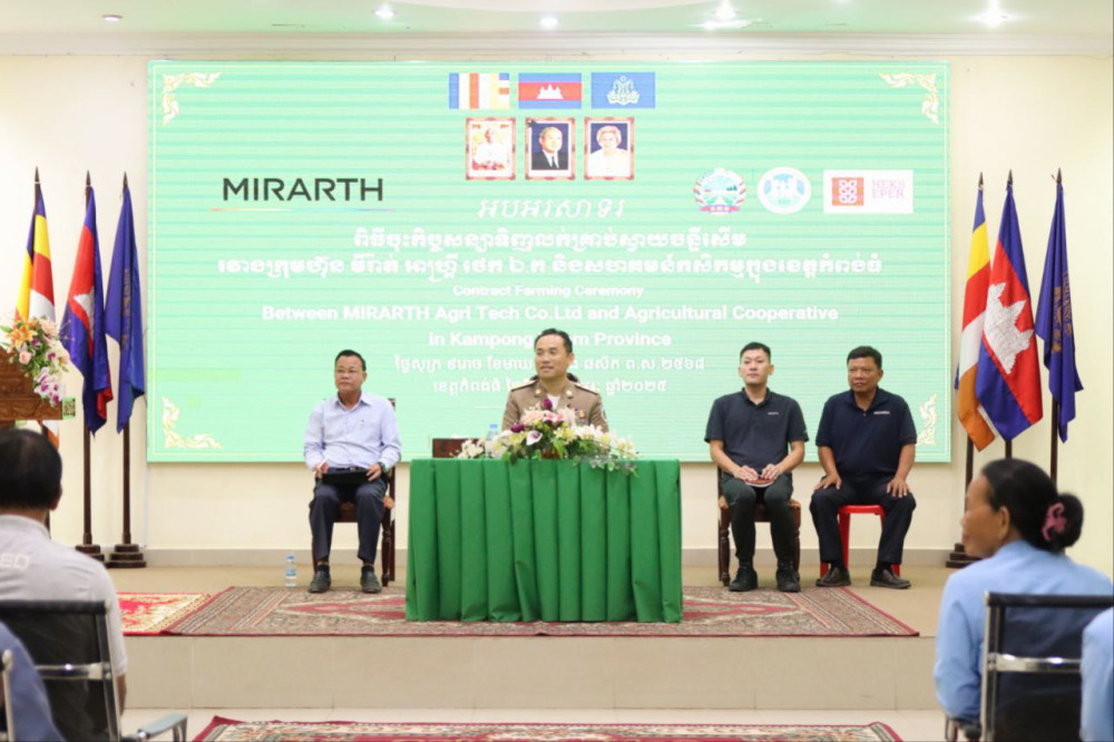 AKP កំពង់ធំ ថ្ងៃទី២២ ខែកុម្ភៈ ឆ្នាំ២០២៥-- គោលនយោបាយវិស័យស្វាយចន្ទីរបស់សម្ដេចមហាបវរធិបតីត្រូវបានបន្តជំរុញទៅមុខជាប់ជាប្រចាំ សំដៅលើកកម្ពស់ជីវភាពរបស់បងប្អូនប្រជាពលរដ្ឋ។ ឯកឧត្តម នួន ផារ័ត្ន អភិបាលខេត្តកំពង់ធំ បានមានប្រសាសន៍លើកឡើងដូចនេះ ក្នុងពិធីចុះកិច្ចសន្យាទិញ-លក់គ្រាប់ស្វាយចន្ទីសើម រវាងក្រុមហ៊ុនមីរ៉ាត់អាហ្រ្គីថេកឯ.ក និងសហគមន៍កសិកម្មក្នុងខេត្តកំពង់ធំ កាលពីថ្ងៃទី២១ ខែកុម្ភៈ ឆ្នាំ២០២៥ នៅសាលប្រជុំសាលាខេត្ត។
