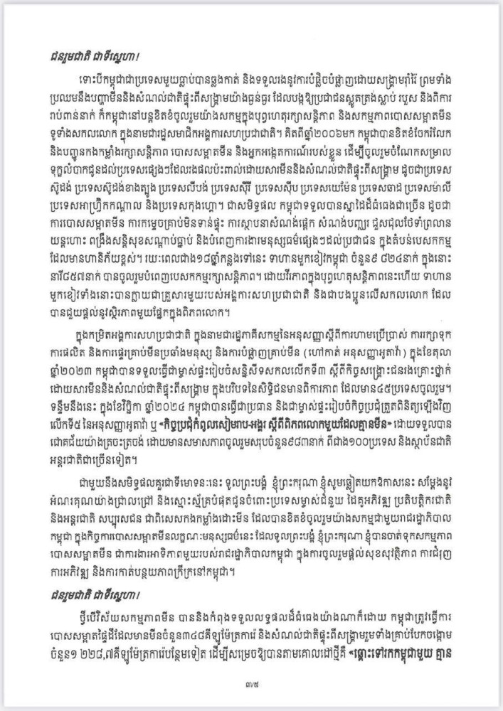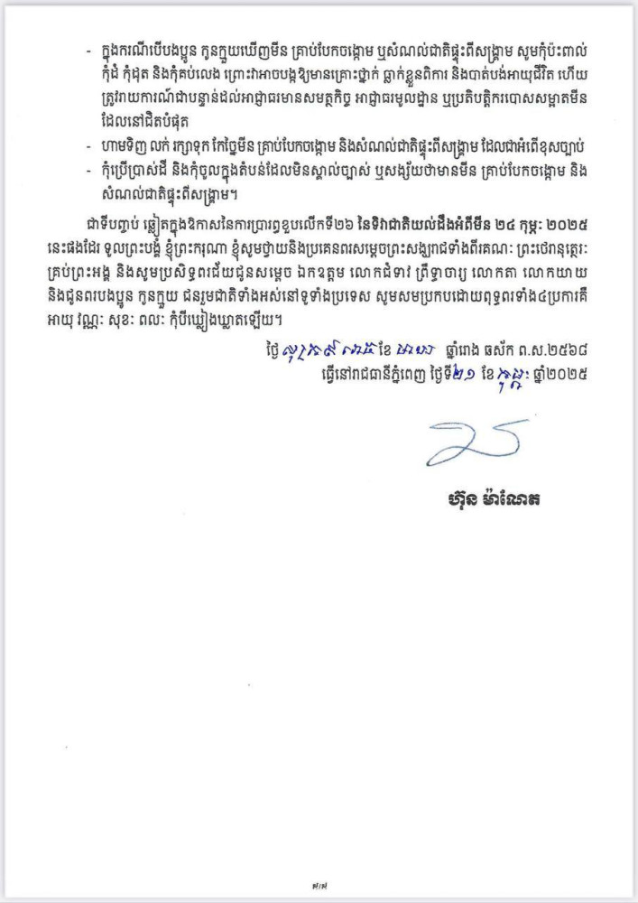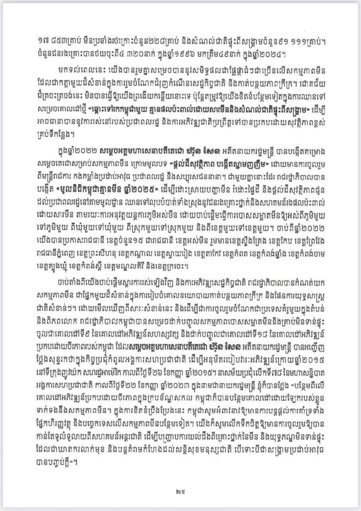 សារលិខិត របស់ សម្តេចធិបតី ក្នុងឱកាសខួបលើក២៦ នៃទិវាជាតិយល់ដឹងអំពីមីន (២៤ កុម្ភៈ ២០២៥)