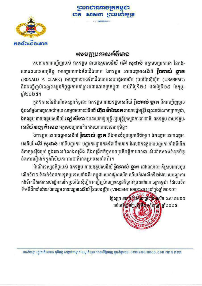 AKP ភ្នំពេញ ថ្ងៃទី២២ ខែកុម្ភៈ ឆ្នាំ២០២៥-តបតាមការអញ្ជើញរបស់ ឯកឧត្តម នាយឧត្តមសេនីយ៍ ម៉ៅ សុផាន់ អគ្គមេបញ្ជាការរង នៃកងយោធពលខេមរភូមិន្ទ មេបញ្ជាការកងទ័ពជើងគោក ឯកឧត្តម នាយឧត្ដមសេនីយ៍ រ៉ូណាល់ ខ្លាក (RONALD P. CLARK) មេបញ្ជាការកងទ័ពជើងគោកសហរដ្ឋអាមេរិក ប្រចាំប៉ាស៊ីហ្វិក (USARPAC) នឹងអញ្ជើញបំពេញទស្សនកិច្ចផ្លូវការនៅព្រះរាជាណាចក្រកម្ពុជា ចាប់ពីថ្ងៃទី២៤ ដល់ថ្ងៃទី២៥ ខែកុម្ភៈ ឆ្នាំ២០២៥។ នេះបើយោងតាមសេចក្ដីប្រកាសព័ត៍មានរបស់ក្រសួងការពារជាតិ។