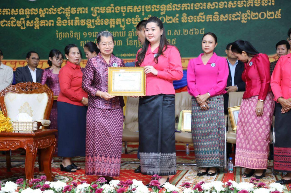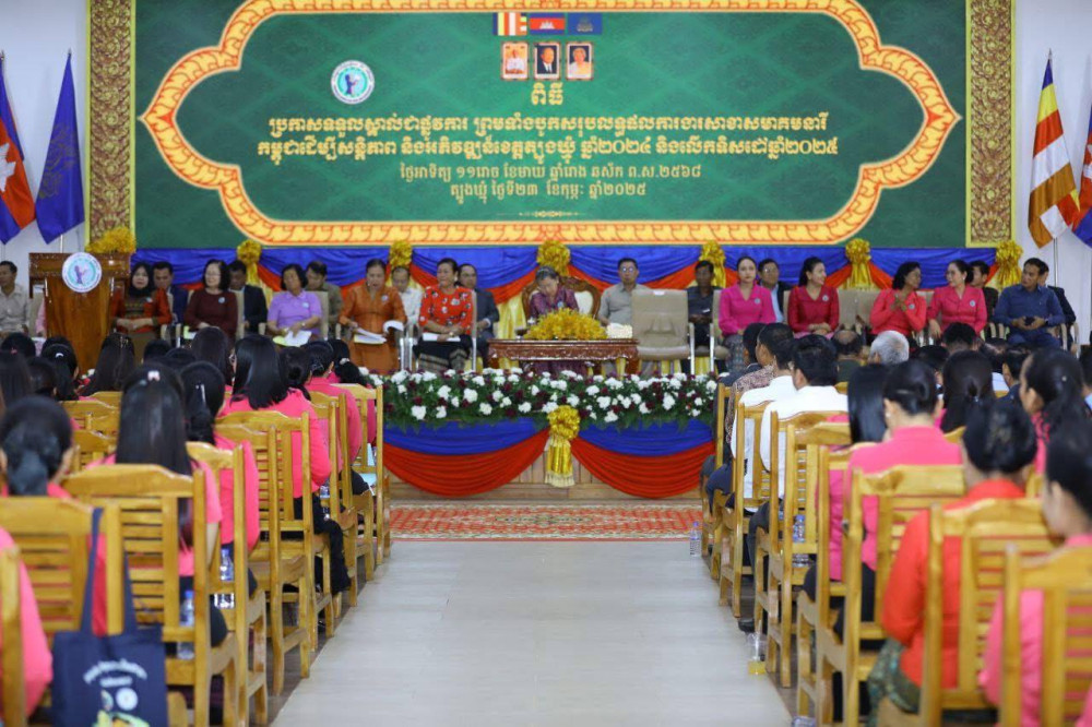 AKP ភ្នំពេញ ថ្ងៃទី២៤ ខែកុម្ភៈ ឆ្នាំ២០២៥-- សម្តេចកិត្តិសង្គហបណ្ឌិត ម៉ែន សំអន ឧត្តមប្រឹក្សាផ្ទាល់ព្រះមហាក្សត្រ និងជាប្រធានសមាគមនារីកម្ពុជា ដើម្បីសន្តិភាព និងអភិវឌ្ឍន៍ បានអញ្ជើញជាអធិបតីក្នុងពិធីប្រកាសទទួលស្គាល់ជាផ្លូវការ និងប្រជុំបូកសរុបលទ្ធផលការងារសាខាសមាគមនារីកម្ពុជា ដើម្បីសន្តិភាព និងអភិវឌ្ឍន៍ខេត្តត្បូងឃ្មុំ ឆ្នាំ២០២៤ និងលើកទិសដៅឆ្នាំ២០២៥ នៅសាលាខេត្តត្បូងឃ្មុំ ដែលមានសមាសភាពចូលរួមប្រមាណ៤៥០នាក់ កាលពីថ្ងៃទី២៣ ខែកុម្ភៈ ឆ្នាំ២០២៥។