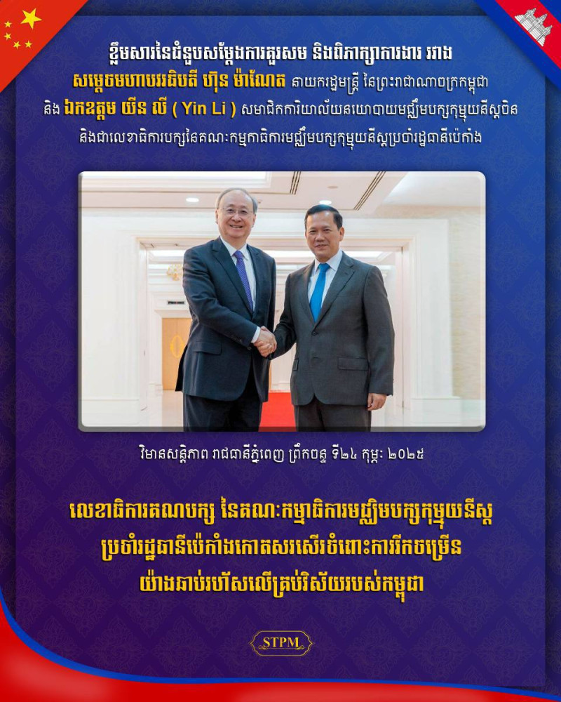 សម្ដេចមហាបវរធិបតី ហ៊ុន ម៉ាណែត នាយករដ្ឋមន្ត្រីនៃព្រះរាជាណាចក្រកម្ពុជា នាព្រឹកថ្ងៃទី២៤ ខែកុម្ភៈ ឆ្នាំ២០២៥នេះ បានអនុញ្ញាតឱ្យ ឯកឧត្តម យីន លី (Yin Li) សមាជិកការិយាល័យនយោបាយមជ្ឈិមបក្សកុម្មុយនីស្តចិន និងជាលេខាធិការគណបក្ស នៃគណៈកម្មាធិការមជ្ឈិមបក្សកុម្មុយនីស្ត ប្រចាំរដ្ឋធានីប៉េកាំង ចូលជួបសម្ដែងការគួរសម និងពិភាក្សាការងារ នៅវិមានសន្ដិភាព។
