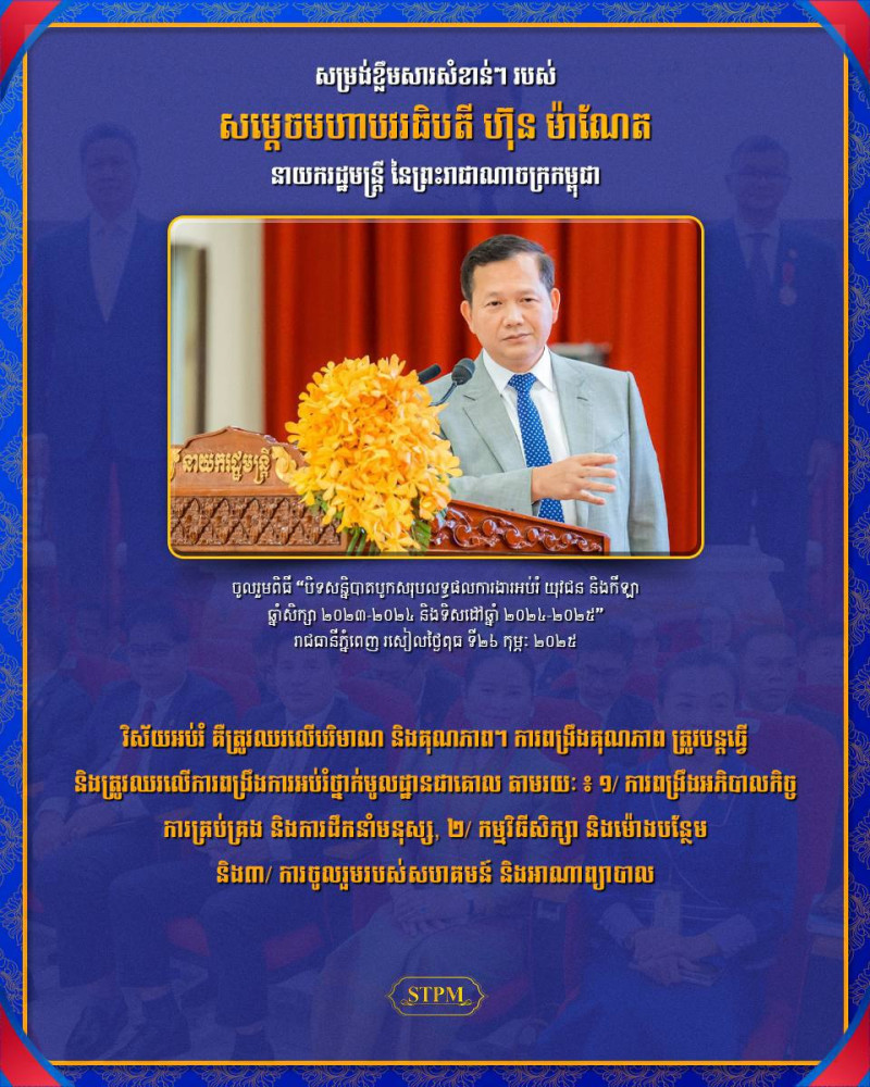 សម្តេចមហាបវរធិបតី ហ៊ុន ម៉ាណែត នាយករដ្ឋមន្ត្រីនៃព្រះរាជាណាចក្រកម្ពុជា បានថ្លែងក្នុងពិធីបិទសន្និបាតបូកសរុបការងារអប់រំ យុវជន និងកីឡា ឆ្នាំសិក្សា ២០២៣-២០២៤ លើកទិសដៅសម្រាប់ឆ្នាំសិក្សា ២០២៤-២០២៥ នារសៀលថ្ងៃពុធ ទី២៦ ខែកុម្ភៈ ឆ្នាំ២០២៥ ថា វិស័យអប់រំ គឺត្រូវឈរលើបរិមាណ និងគុណភាព ជាពិសេសសំដៅលើការពង្រឹងគុណភាព ដែលត្រូវបន្តធ្វើ និងត្រូវឈរលើការពង្រឹងការអប់រំថ្នាក់មូលដ្ឋានជាគោលតាមរយៈ៖ ១/ ការពង្រឹងអភិបាលកិច្ច ការគ្រប់គ្រង និងការដឹកនាំមនុស្ស, ២/ កម្មវិធីសិក្សា និងម៉ោងបន្ថែម និង៣/ ការចូលរួមរបស់សហគមន៍ និងអាណាព្យាបាល។