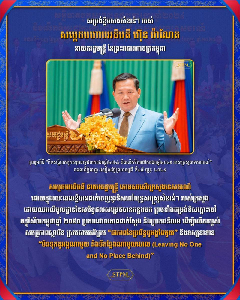 សម្តេចមហាបវរធិបតី ហ៊ុន ម៉ាណែត នាយករដ្ឋមន្ត្រី នៃព្រះរាជាណាចក្រកម្ពុជា បានថ្លែងក្នុងពិធីបិទសន្និបាតបូកសរុបលទ្ធផលការងារឆ្នាំ ២០២៤ និង លើកទិសដៅការងារឆ្នាំ ២០២៥ របស់ក្រសួងទេសចរណ៍ នៅរសៀលថ្ងៃព្រហស្បតិ៍ ទី ២៧ ខែ កុម្ភៈ ឆ្នាំ ២០២៥ បាន កោតសរសើរក្រសួងទេសចរណ៍ ដោយក្នុងរយៈពេលខ្លីបានដាក់ចេញនូវទិសដៅយុទ្ធសាស្ត្រ សំខាន់ៗរបស់ក្រសួង ដោយឈរលើមូលដ្ឋាននៃសមិទ្ធផលសម្រេចបានកន្លងមក ព្រមទាំងតម្រង់ទិសឆ្ពោះទៅចក្ខុវិស័យកម្ពុជាឆ្នាំ ២០៥០ ប្រកបដោយភាពជាក់ស្ដែង និងប្រាកដនិយម ដើម្បីលើកកម្ពស់សមត្ថភាពស្ថាប័ន ស្របតាមអភិក្រម "ជវភាពនៃប្រព័ន្ធតួអង្គតែមួយ" និងទស្សនាទាន "មិនទុកតួអង្គណាមួយ និងទីកន្លែងណាមួយចោល (Leaving No One and No Place Behind)" ។