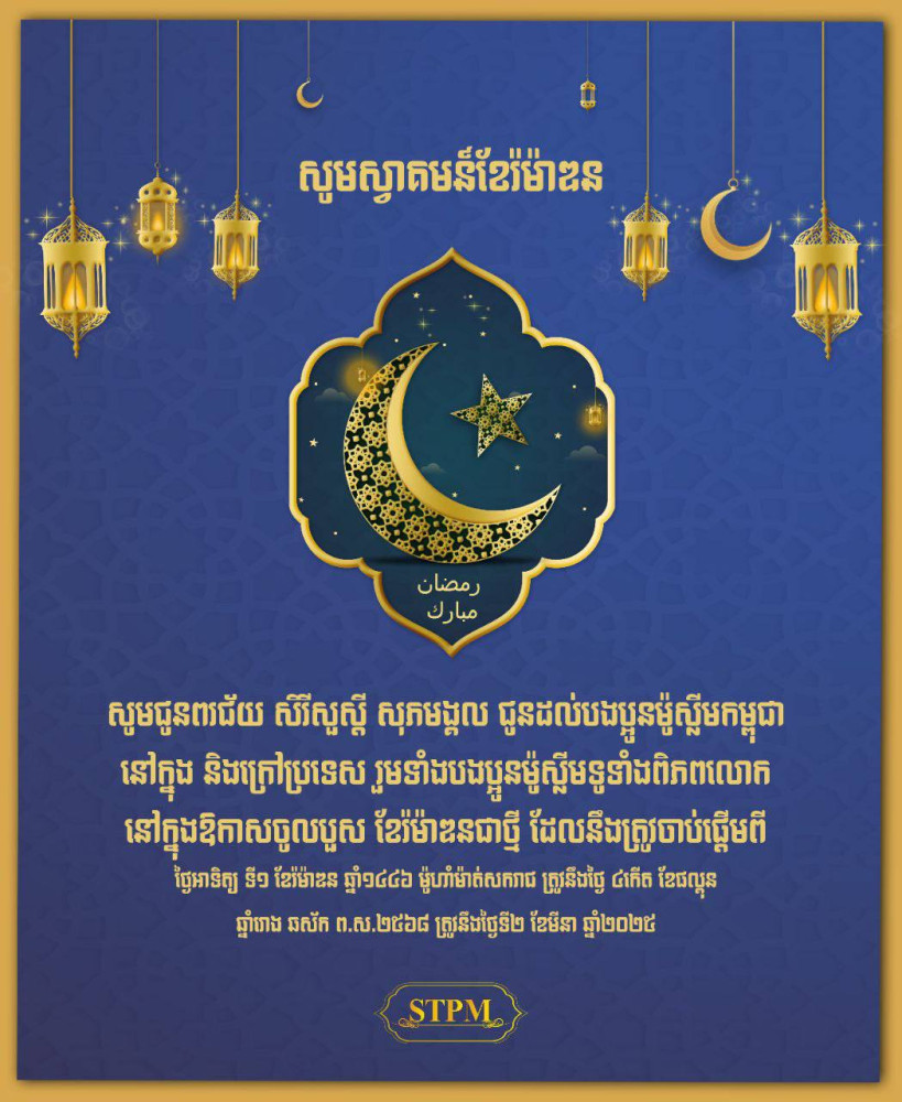 ជាថ្មីម្តងទៀត សម្ដេចធិបតី សូមព្រះអល់ឡោះប្រទានពរជ័យ សិរីសួស្តីដល់បងប្អូនម៉ូស្លីមកម្ពុជា ទាំងក្នុង និង ក្រៅប្រទេស ព្រមទាំងបងប្អូនម៉ូស្លីម លើសាកលលោក សូមជួបប្រទះតែសេចក្តីសុខ សុភមង្គល និងជោគជ័យក្នុងកិច្ចប្រតិបត្តិជំនឿសាសនាឥស្លាម អំឡុងខែបួសរ៉ម៉ាឌន ឆ្នាំ២០២៥ នេះ កុំបីឃ្លៀងឃ្លាតឡើយ៕