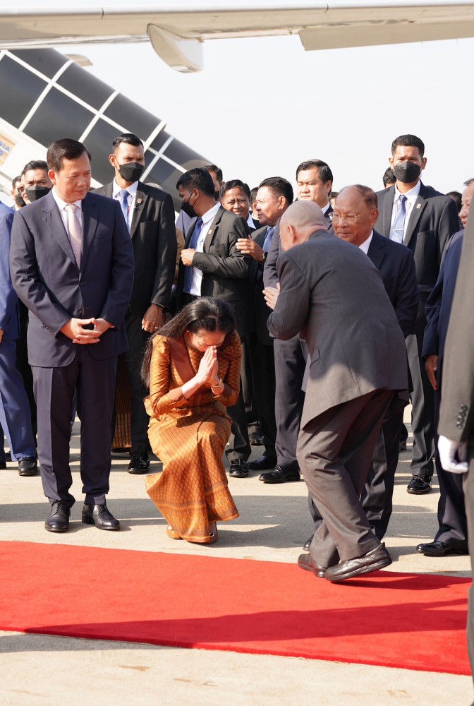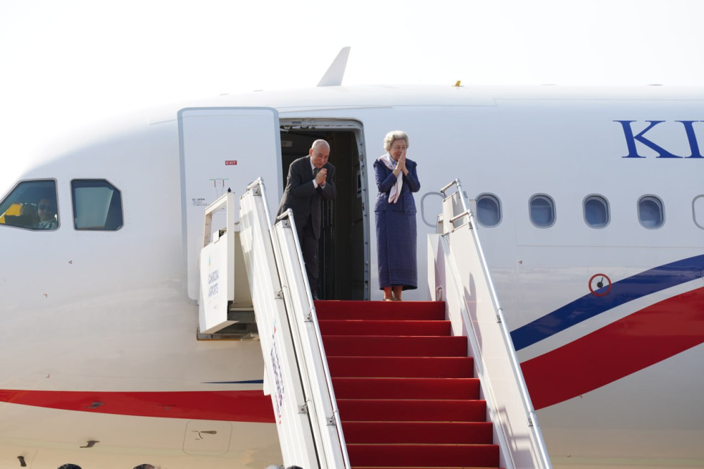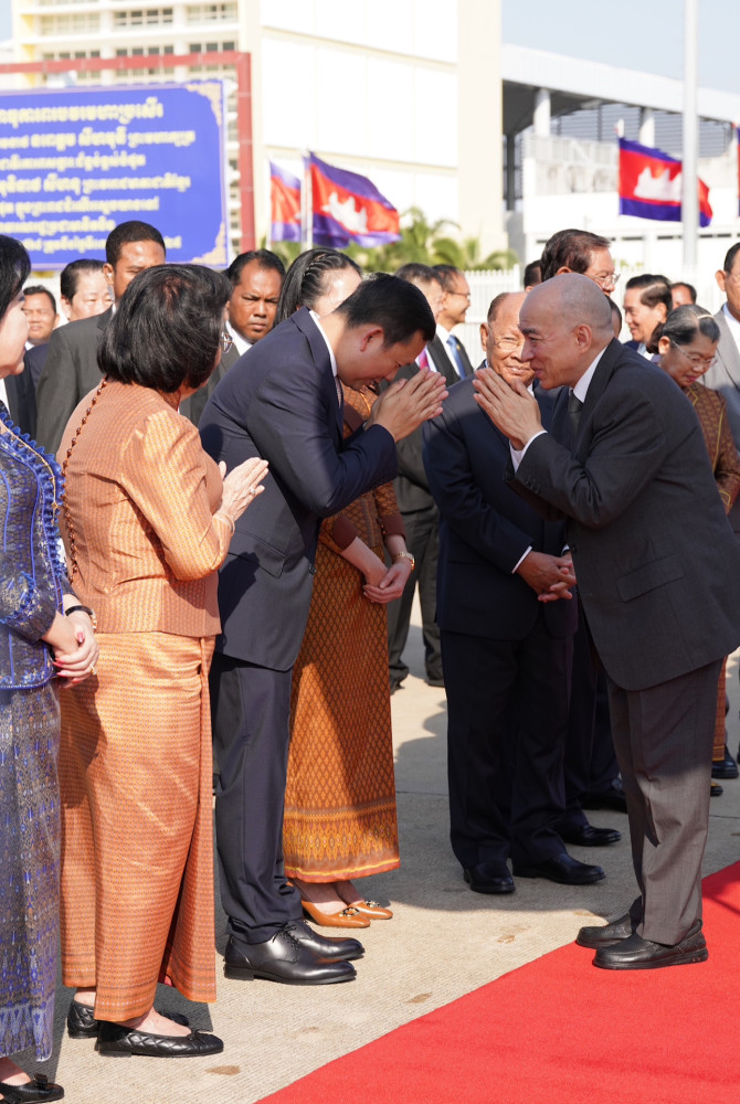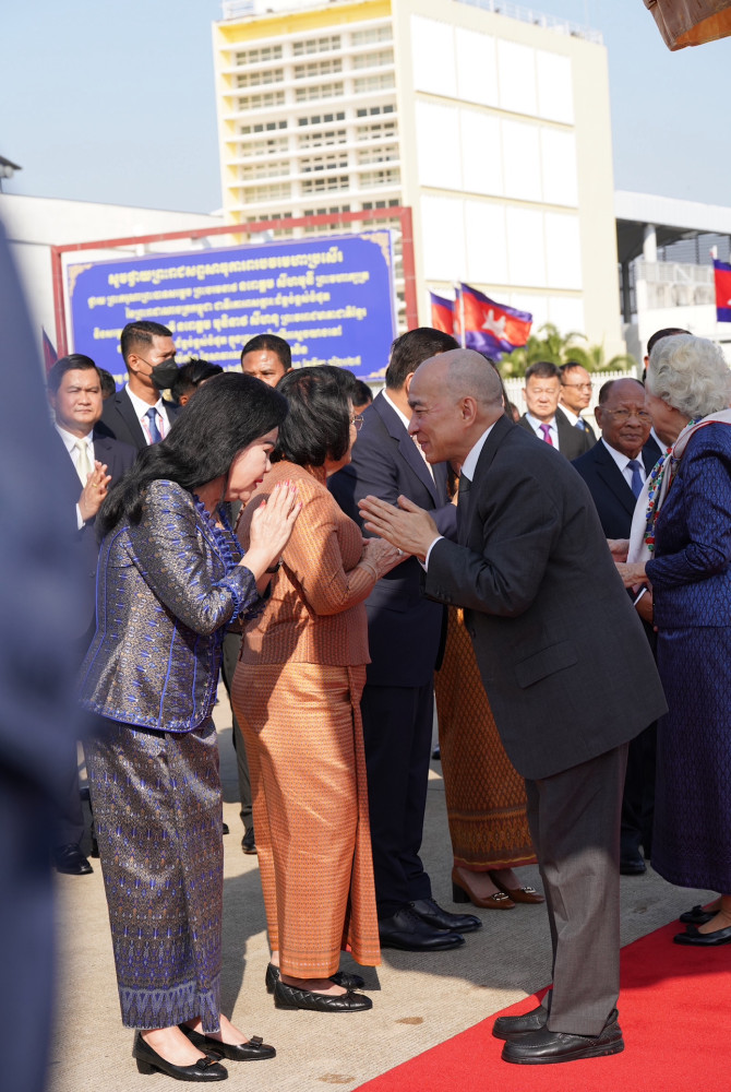 យាង និងអញ្ជើញថ្វាយព្រះរាជដំណើររបស់ព្រះអង្គទាំងទ្វេនៅឯព្រលានយន្តហោះអន្តរជាតិភ្នំពេញា មានវត្តមាន សម្ដេចមហារដ្ឋសភាធិការធិបតី ឃួន សុដារី ប្រធានរដ្ឋសភា សម្តេចមហាបវរធិបតី ហ៊ុន ម៉ាណែត នាយករដ្ឋមន្ត្រី នៃព្រះរាជាណាចក្រកម្ពុជា និងលោកជំទាវ សម្ដេចកិត្តិព្រឹទ្ធបណ្ឌិត ប៊ុន រ៉ានី ហ៊ុនសែន សម្ដេចអគ្គមហាពញាចក្រី ហេង សំរិន ប្រធានកិត្តយសនៃឧត្ដមប្រឹក្សាផ្ទាល់ព្រះមហាក្សត្រ ព្រមទាំង សម្ដេច ឯកឧត្ដម លោកជំទាវ ជាសមាជិកសមាជិកា ឧត្ដមប្រឹក្សាផ្ទាល់ព្រះមហាក្សត្រ និងមន្ត្រីអ្នកមុខអ្នការជាច្រើនរូបទៀត។ ដោយឡែក ឯកឧត្តម WANG Wenbin ឯកអគ្គរដ្ឋទូតនៃសាធារណរដ្ឋប្រជាមានិតចិនប្រចាំកម្ពុជា ក៏មានវត្តមានក្នុងឱកាសនោះផងដែរ។