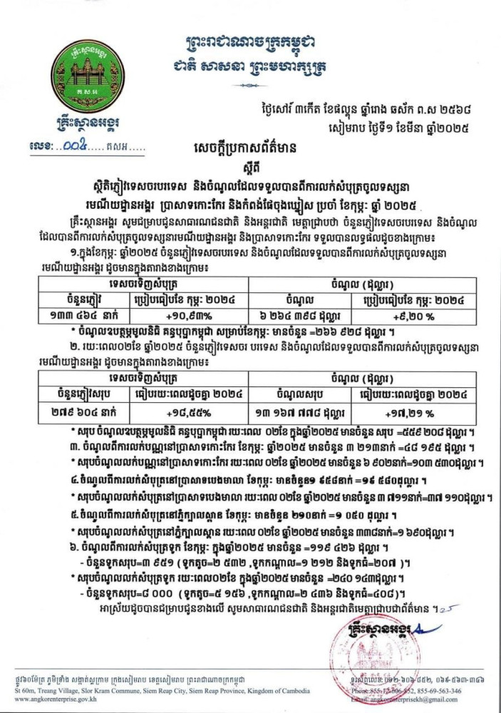 សេចក្ដីប្រកាសព័ត៌មានរបស់គ្រឹះស្ថានអង្គរ ប្រាក់ចំណូលដែលទទួលបានចំនួន ១៣,១៦៧,៧៧៨ដុល្លារ ក្នុងរយៈពេល២ខែដើមឆ្នាំនេះ គឺកើនឡើង១៧.២១ភាគរយ បើប្រៀបធៀបរយៈដូចគ្នានឹងឆ្នាំ២០២៤។