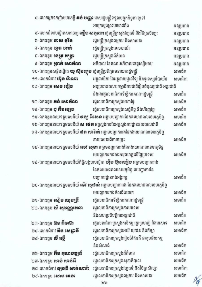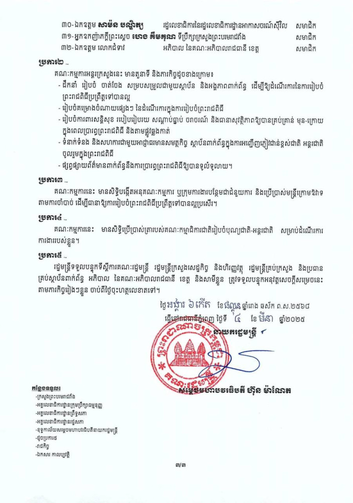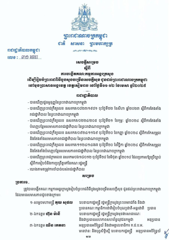 សេចក្តីសម្រេច បង្កើតគណៈកម្មការអន្តរក្រសួង ដើម្បីរៀបចំព្រះរាជពិធីបួងសួងចម្រើនសេចក្តីសុខ ជូនដល់ព្រះរាជាណាចក្រកម្ពុជា